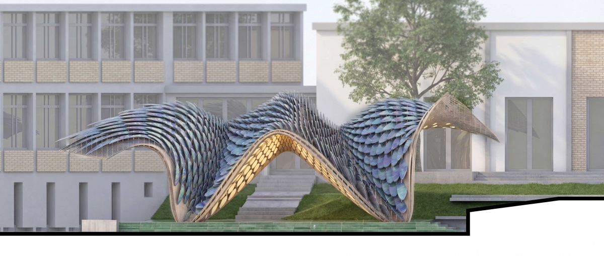 Diseñado por los arquitectos José Ramón Tramoyeres y Javier Cortina, fundadores de ggstudio, y construido por Volúmenes y Vareta, la intervención propone un nuevo modelo de arquitectura cultural: desmontable, reutilizable e itinerante. Con un diseño geométrico orgánico y continuo, la estructura modular ensamblada de madera y cerámica permite su itinerancia internacional, con Milán como próximo destino previsto.