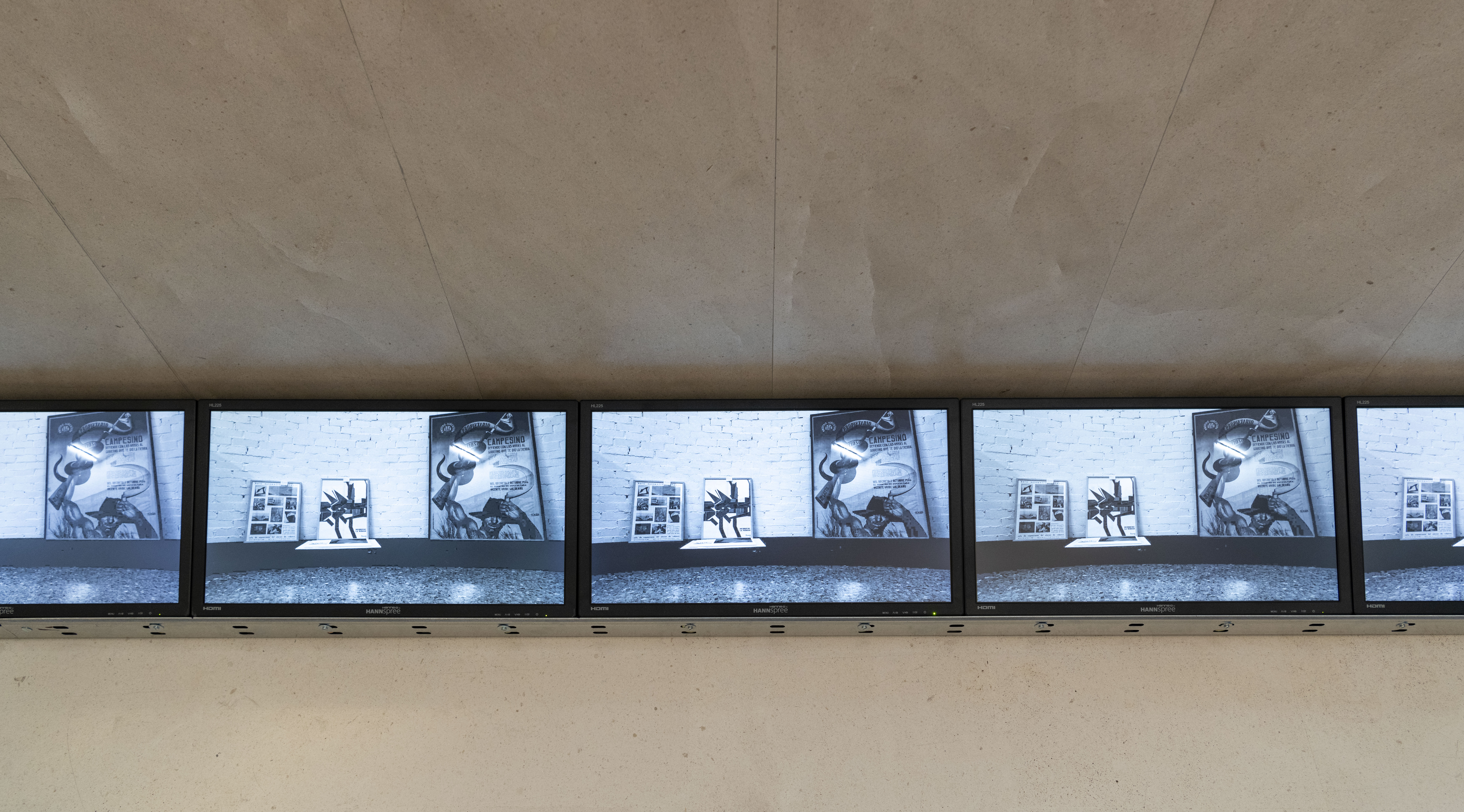 La segunda hilera está formada de altavoces y se sitúa a cierta distancia de las pantallas, en un luminoso pasillo que acoge la sonoridad del museo.