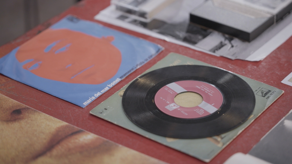 “Jugamos con el espacio y con significados para hablar de cómo se encripta la lengua para cantar un lema. En el estudio -Polar Studios, el mismo en el que grababa sus temas Abba, en Suecia- hacemos diferentes ejercicios para encriptar el mensaje y seguir cantando sobre lo que nos interesa”. Una operación de traducción que se contempla y explica en la pieza audiovisual que preside la sala y que se comprende en el “terreno de choque y resistencia” donde se pueden ver vinilos y casetes que también fueron censurados en la época franquista como Un ramito de violetas o La estaca.