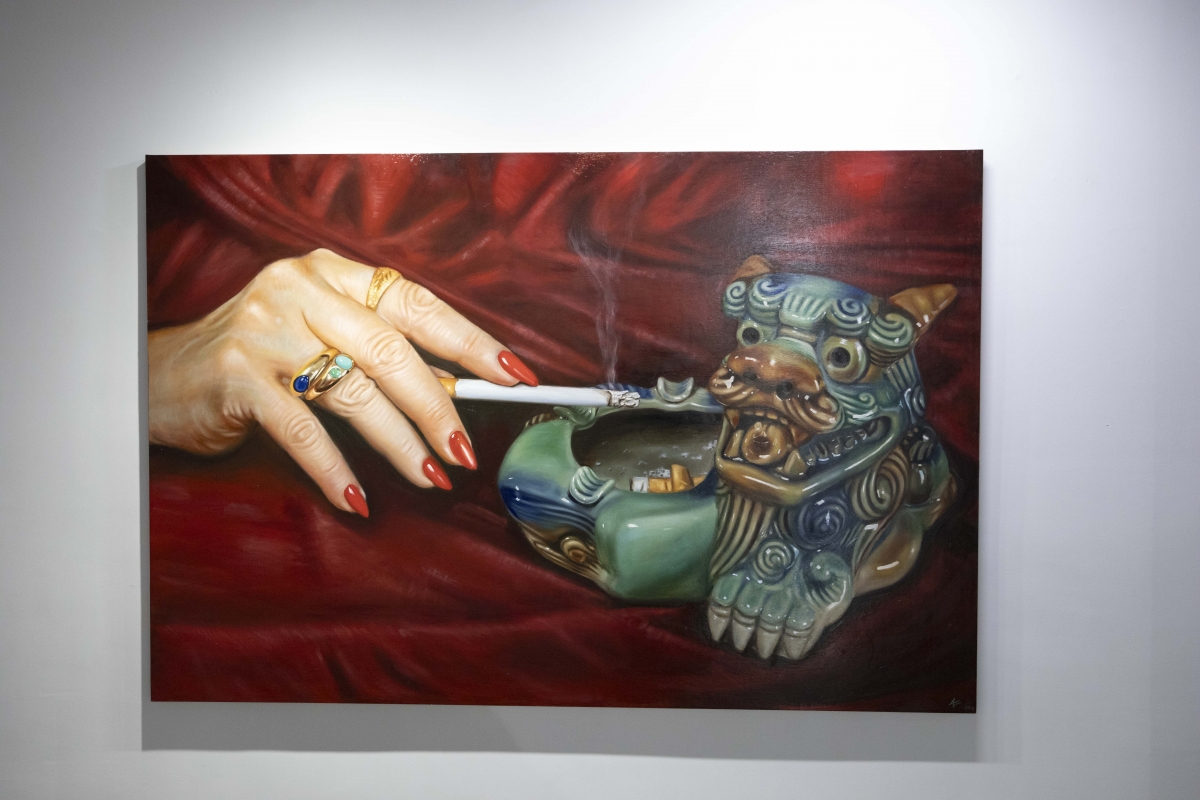 Una acción que le sirve para “redecorar” la que fuera su casa y “regerenar un espacio que se ha perdido”. Ambos artistas buscan en internet y en las casas de sus familiares los objetos que le sirven para contar su relación con una época no vivida, y que ayudan al espectador a comprender su idea artística. Ovejero pinta jarrones, figuras falsas de Lladró y decoraciones chinas que ponen al objeto en un punto de inflexión. “Es una muestra en la las cosas se presentan por lo que son, estos se apropian del espacio y me ayudan a construir una realidad en la que lleno de terciopelo el hogar para darle un nuevo significado”.