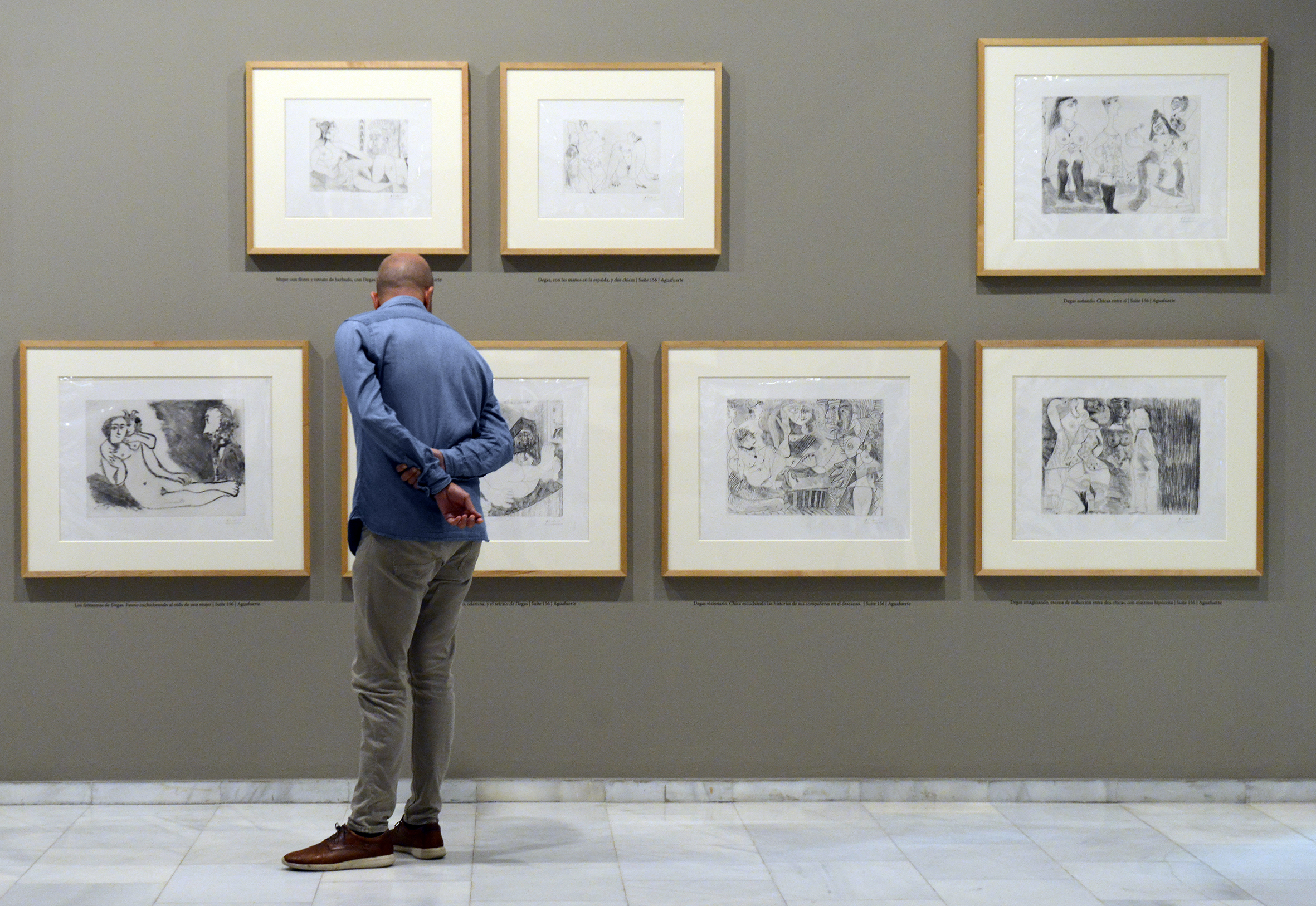 Picasso en su taller del castillo Grimaldi en Antibes. 1946. Michael SimaHombre viejo concipiscente e impotente con una prostituta española sobre las rodillas, marinero tapándose el sexo y jardinero, 1970Y una serie dedicada exclusivamente a actuar como "vouyeur" de Degas, en las visitas de este a los prostíbulos. Contaba también Castro, que Degas ya era impotente entonces, así que muchas veces iba solo a mirar, a no tocar a las chicas, incluso únicamente a dibujar. Picasso traslada eso a grandes bacanales en las que incluye, de diferentes maneras, al maestro francés.