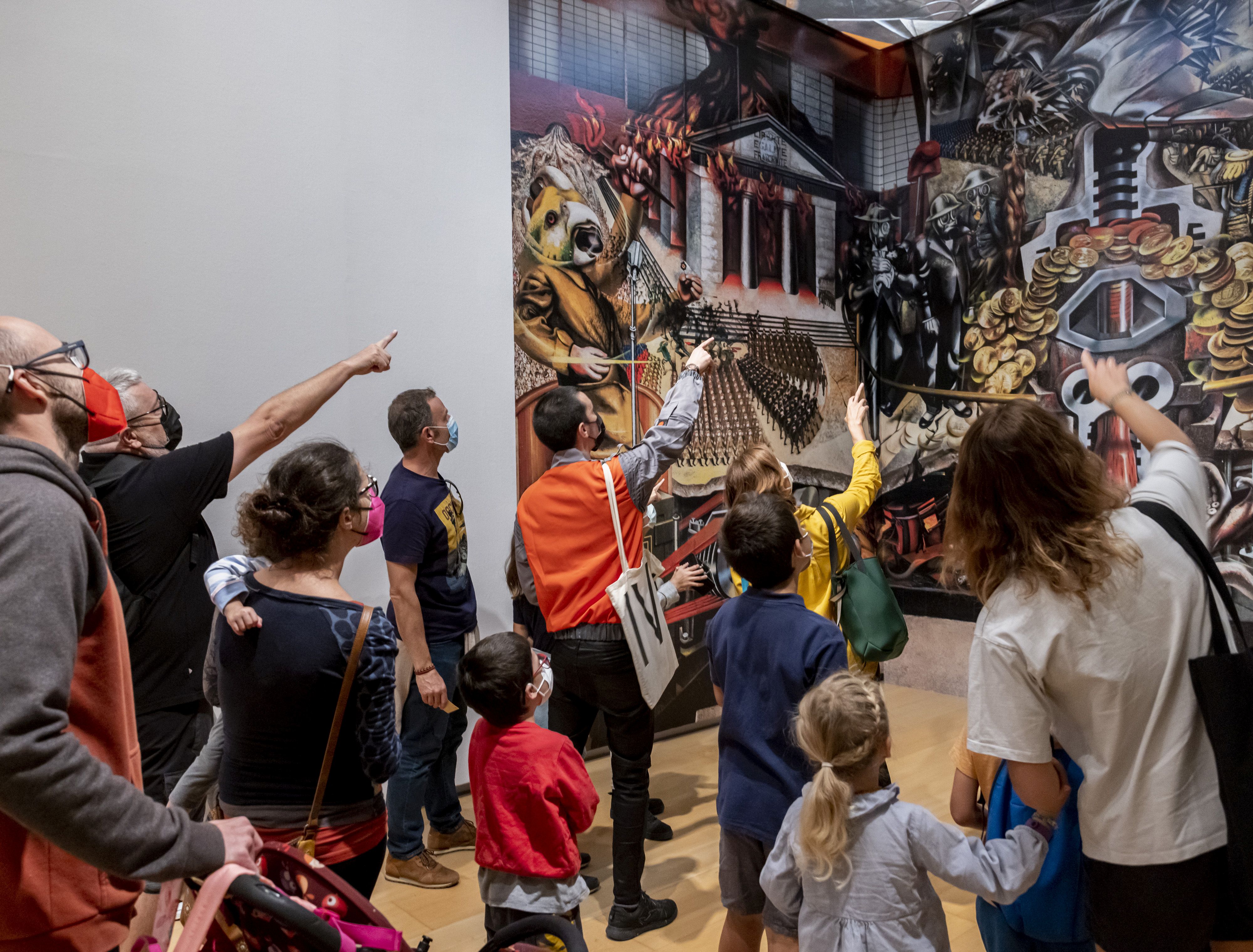 Una vez superadas todas las pruebas del recorrido en la exposición, los asistentes generan un mural colectivo, como los de Josep Renau, con mensajes para la sociedad futura. De esta forma, los juegos permiten trabajar en familia conceptos como el cambio climático, el progreso científico y el compromiso social, de una manera didáctica y divertida.