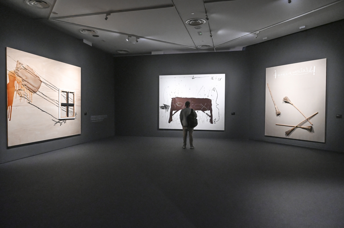 La sala de exposición, de luz contenida y cuyos muros han sido pintados de negro, se presenta ahora como un lugar que invita a ese tú a tú con el artista, un espacio desde el que, precisamente, se potencia este diálogo con la constante presencia de la voz de Tàpies a través de frases que aparecen plasmadas entre las piezas exhibidas. “El artista debe vivir intensamente su tiempo, pero también distanciarse de él para poder comprenderlo”, reza una de ellas.