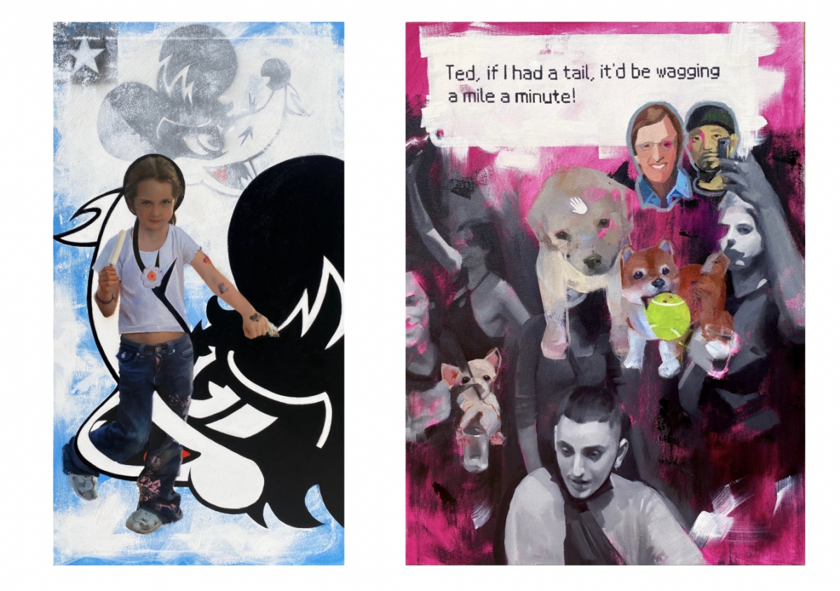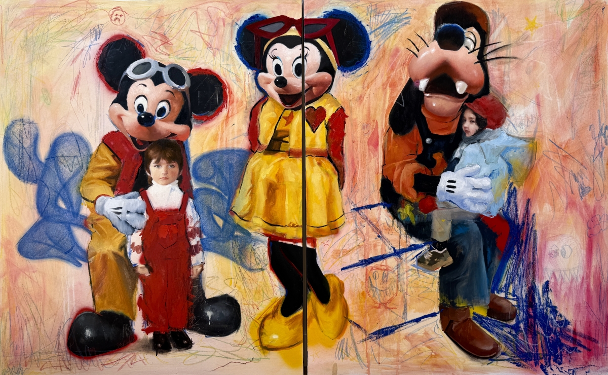 Entre sus cuadros, el famosísimo Mickey Mouse -un adulto con disfraz de ratón- se da la mano con los adorables perritos del videojuego Nintendogs y con un Peter Pan que sobrevuela una fiesta. Lo hace pensando precisamente en la dicotomía de los dos mundos: el adulto y el infantil y las metáforas que hay entre ambos mundos. “Me interesa mezclar las imágenes de los niños con otras más modernas, me interesa la conversación que se genera entre imágenes que parecen contrapuestas en un momento en el que yo misma estoy en transición”.