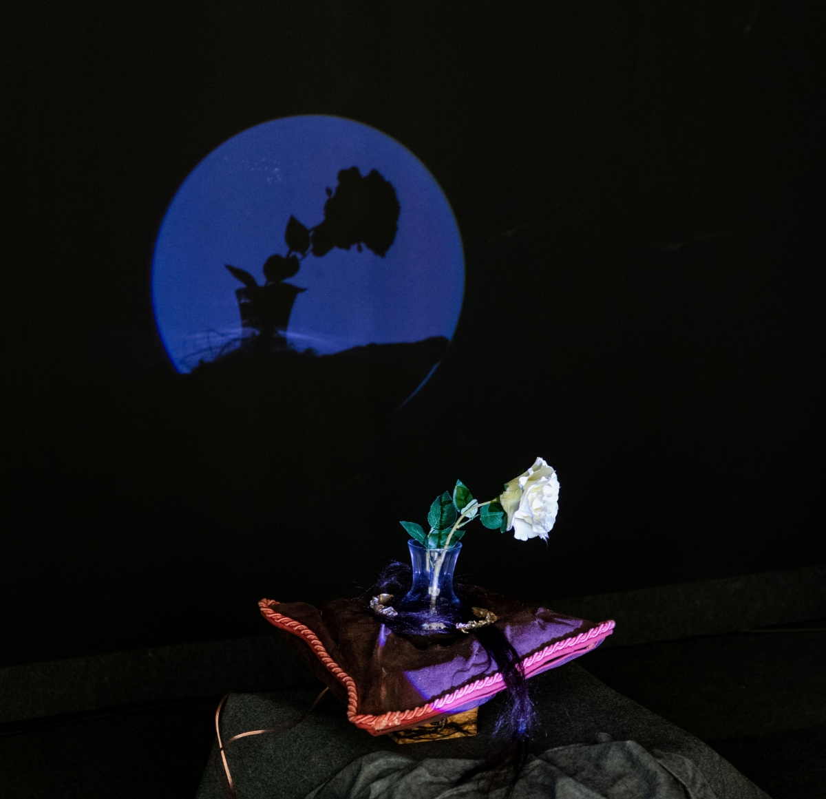 Siguiendo el orden del recorrido, un enorme banquete, de Gema Quiles, invita al espectador a sentarse junto a sus piezas. Una mesa llena de copas y borlas de colores sirven para que Quiles creen un espacio en el que hablar de “lo natural y generar un espacio de reunión”, mientras todo se refleja en una muestra muy pictórica que rodea a una instalación en la que hay “montañas y ríos dibujados sobre una mesa en la que están todxs invitadxs”. Tras su obra está la de la artista Bella Báguena, quien aporta sonido al laberinto con una instalación llamada Algo cayó con la que busca “acercar la experiencia auditiva de lo musical al espacio museístico”.