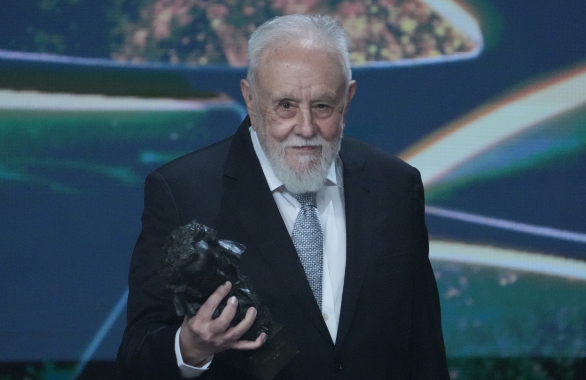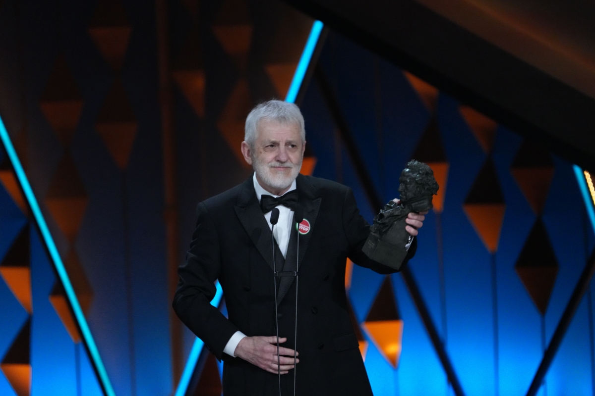 También subió a recoger el Goya de honor el director, guionista, productor, escritor y periodista deportivo Gonzalo Suárez. Ante un público en pie se alzó con el cabezón y dedicó su discurso a la ciudad de Barcelona, donde “escribió sus primeros libros y escribió sus primeras películas”. Después de librarse del Goya porque “le estaba estorbando” contó un cuento que servía de metáfora para hablar del valor del cine, como “el último reducto con el que podemos soñar despiertos” ante un mundo gobernado por la Inteligencia Artificial. “Estoy orgulloso de observar que el cine ha sobrevivido a las redes y a las cavernas, aunque tengo que admitir que ahora el bisonte de las cavernas soy yo”.