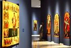 La Virgen y San Nicolás ocupan dos bloques importantes de la muestra, así como las piezas de iconostasios --muros que parten de un lado a otro del ábside y que se decoran con iconos distribuidos en hileras--, procedentes de diversas iglesias y períodos. Entre los trabajos que es posible admirar en Valencia, figuran los de las Puertas Reales y la Puerta del Altar del Buen Ladrón.