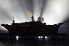 El uso de la pirotecnia y de los elementos móviles acompaña la travesía de un barco que, en cuestión de segundos, se transforma de un idílico velero a un petrolero.
