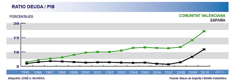 Siguiendo la progresión histórica de la deuda valenciana se observa la tendencia alcista desde hace más de una década. Si en cuando acabó 1995 la deuda pública acumulada, contando las administraciones públicas, representaba un 6,98% del PIB regional, en los años sucesivos siguió incremnetando esa proporción hasta alcanzar el nivel actual, el 17,2% como refleja el informe. El único periodo de descenso del nivel, fue de 2005 a 2007, donde la cifra bajó del 13,28% al 13,14%, coincidiendo con el boom inmobiliario".