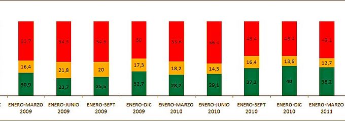 Como primera conclusión, el conjunto de la economía provincial se sitúa, en el primer trimestre de 2011, último periodo estudiado, por debajo de la trayectoria seguida por la Comunidad Valenciana y España. Y esta afirmación se mantiene desde 2008.