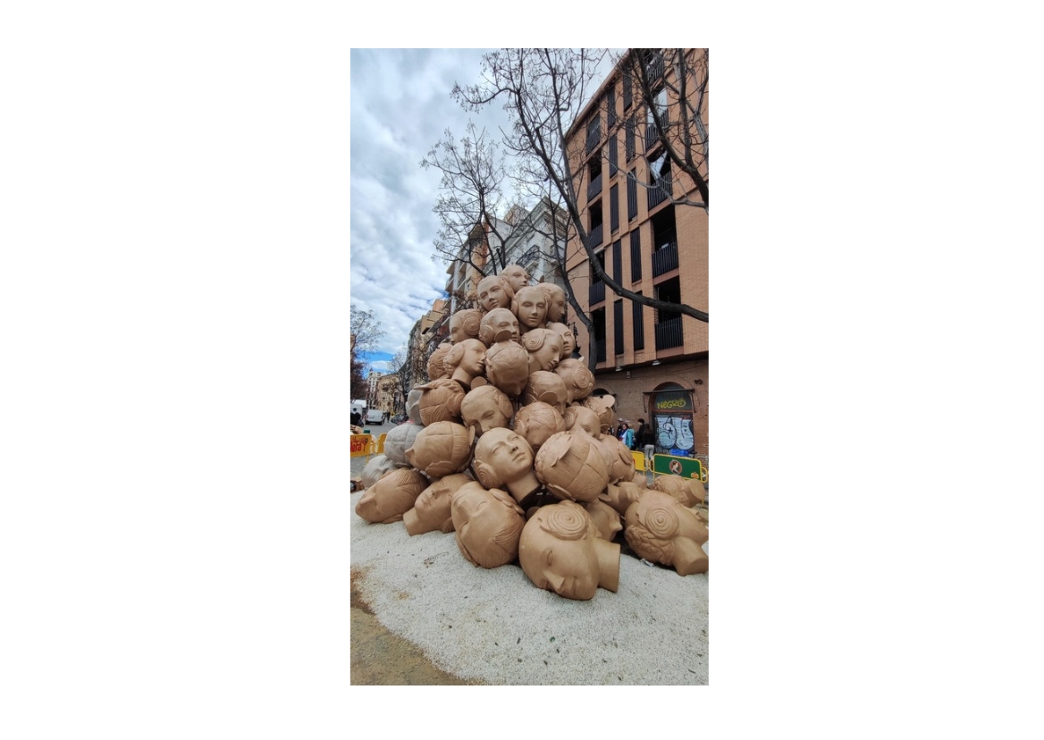 Si tuviera que elegir una obra que me define como diseñador gráfico, sería El pes de la tradició. Era una montaña de cabezas de mujeres falleras apiladas, construidas en cartón piedra y materiales sostenibles. Me interesaba hablar del peso simbólico que soportan las tradiciones —especialmente sobre el cuerpo femenino— pero hacerlo desde la forma, no desde el panfleto.