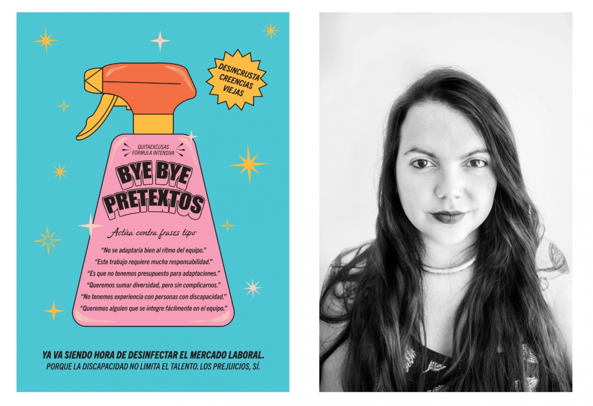 “Las personas discapacitadas somos mucho más que eso, somos personas alegres que queremos hacer cosas y eso es lo que reivindico desde el diseño. Trabajo una gráfica más reivindicativa, cañera y colorida que busca expresar en tono irónico las realidades que vivimos”, destaca la artista. Entre su obra se pueden ver productos de limpieza que ayudan a “desinfectar el mercado laboral” o “desincrustar creencias viejas” gracias a la lucha contra los prejuicios que se tienen sobre las personas discapacitadas a la hora de acceder al mercado laboral, por ejemplo. Un enorme limpiador rosa promete la “fórmula intensiva, quita excusas” contra frases que funcionan como negativas como: “No tenemos experiencia con personas con discapacidad” o “no se adaptarían bien al ritmo de equipo”.