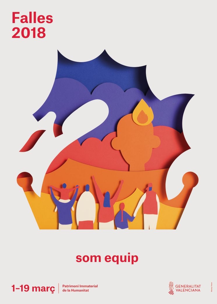 El lema bajo el que se presenta la comunicación de la Generalitat Valenciana, ‘Som equip’, hace referencia a la Brand essence del gobierno autonómico, un proyecto creado por la agencia de comunicación Trumbo que derivó en el claim ‘Tots a una veu’. De esta forma se continúa con la fórmula 'som', utilizada en los tres carteles del Ayuntamiento de València, pero vinculando el mensaje a la esencia de marca del gobierno autonómico. En el caso de los tres carteles para la ciudad, se dividen en uno protagonizado por el fuego que aporta los colores cálidos con un ninot y un personaje que representa el artista fallero; el corazón, con tonos azules y turquesas, que recuerdan el Mediterráneo y el cielo del día, con una escena con humo que representa el momento de la mascletà; mientras que en el interior de la peineta fallera, el tercer cartel, se han incluido elementos tradicionales, flores que recuerdan la Ofrenda y una chica tocando la dolçaina.