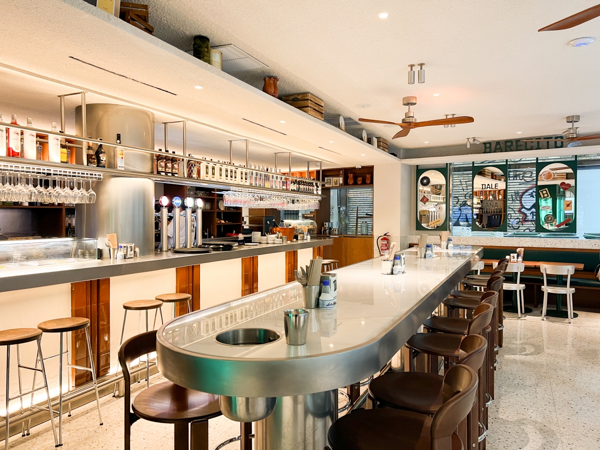 Pero volvamos a una de las callejuelas que dan paso a la plaza, concretamente en el número 4 de la calle Cotanda, Barecito es ese homenaje al bar de toda la vida. En palabras del propio Rafa Recuenco, cofundador del Grupo Gastroadictos, “el altar de un bar es la barra, el punto de partida, donde todo empieza. Ahí está el profesional que conoce a los clientes de siempre, el que reparte y pone ritmo. Barecito es un bar pequeño, y eso nos obligó a pensar una barra que lo hiciera todo: atender al cliente de paso, al que solo quiere una caña o al que viene a disfrutar de la comida y la charla en la mejor compañía. Por eso la barra ocupa casi todo el local. Queríamos que fuera una barra viva, que funcionara a todas horas y para todo el mundo”.