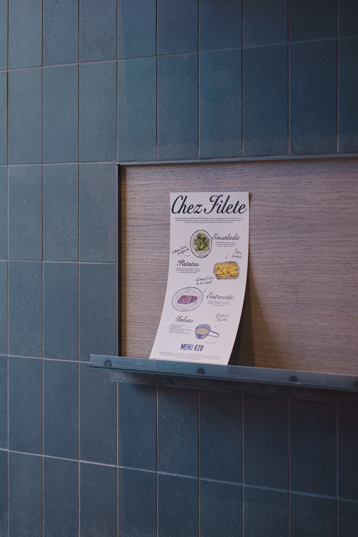 Lo hicieron con un trabajo de reforma e interiorismo que ha corrido a cargo de Francesc Rifé Studio, el reconocido estudio catalán que ha firmado restaurantes como Habitual o Ricard Camarena Restaurant. En palabras de sus propios creadores: “Ubicado en la planta baja de un edificio modernista valenciano, Chez Filete parte de la reducción: un plato, cuidadosamente preparado, y un espacio con un mismo enfoque. Azulejos verdes Fe de Nadis Design y madera natural de roble, dan forma a un interior compacto y urbano donde la comida, el sonido y la atmósfera reciben la misma atención”, indican.