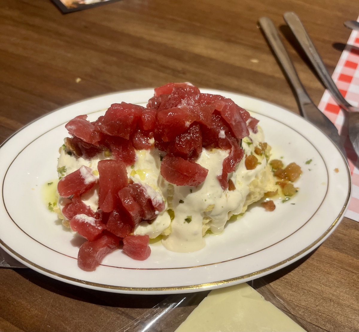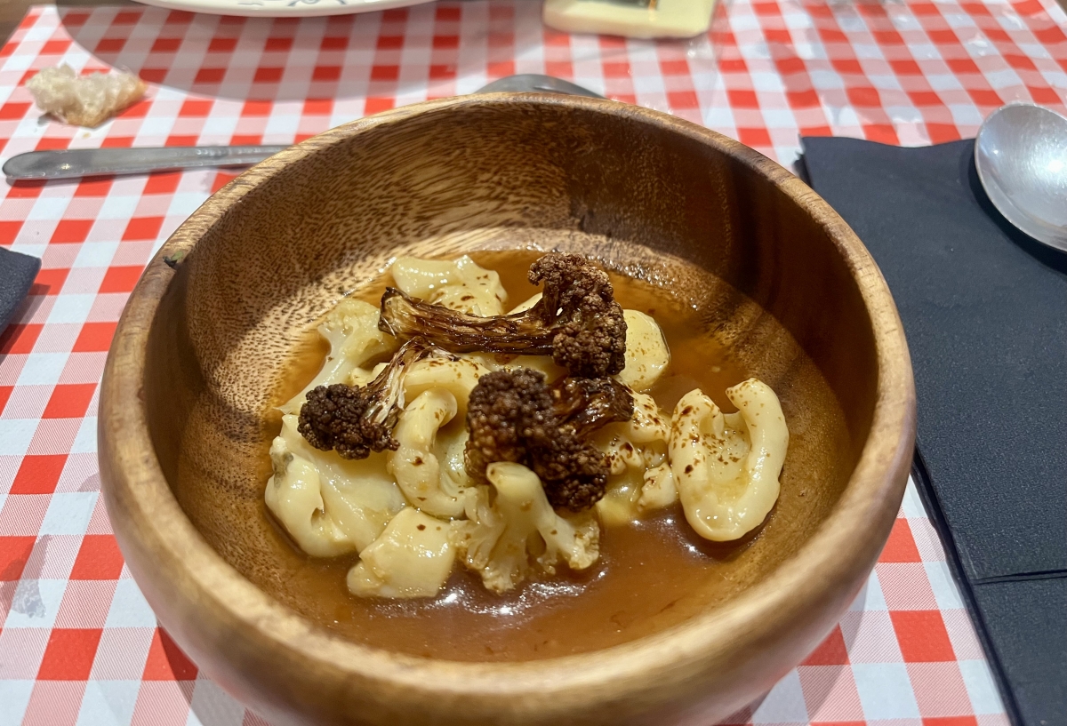 Con 28 años se aventuró a abrir su propio local. «Durante los primeros meses, la idea era muy sencilla. Un bar de pueblo con vitrina, platos básicos y una carta con seis vinos. No queríamos marear a los clientes hasta que nos dimos cuenta que sí, que querían que les mareásemos. Nos fue bien desde el principio», reconoce. La propuesta de El Galliner no es fácilmente clasificable, ni siquiera el cocinero sabe definirla: «Hago lo que me gusta. Quiero que los platos tengan sabor, que empiecen desde un guiso pero actualizado. Hago muchos escabeches revisados. La titaina, la ensaladilla, la panceta… todo es a mi manera. Es un concepto de lo que yo llamo cocina mareada. Quiero que todas las recetas sean reconocibles en boca, pero que tengan algo, que no sea lo de siempre”, señala. Sorprende la ensalada de tomate escabechada con helado y el guiso de manitas. La ensaladilla con tartar de atún y mayonesa de piparras elevan esta tapa de siempre, me gusta mucho la coliflor.