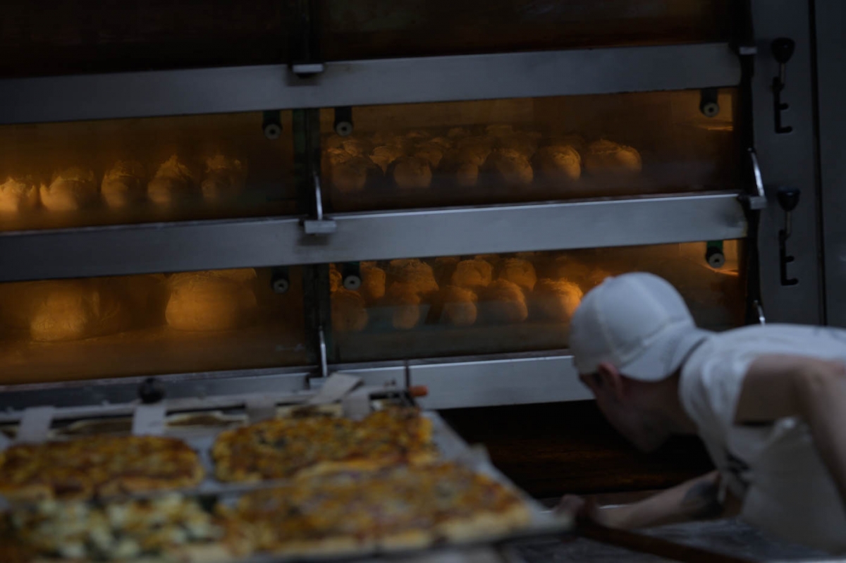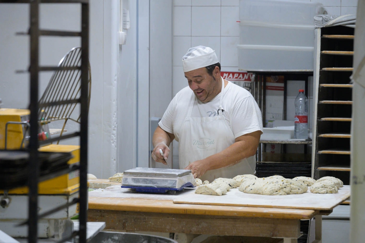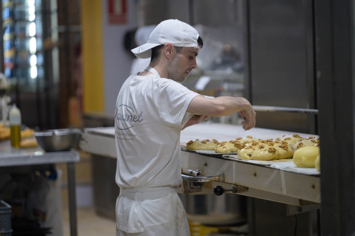 Al fondo del obrador pliegan a mano medio millar de barras de pan cada día Mari Carmen Fernández y Eduardo Masanet. Pan fermentado durante 18 horas, que empiezan a cocer a partir de las 5 de la mañana, cuando Eduardo llega a su horno. Uno de esos hornos familiares que compró su abuelo Emilio en el año 1963 y que luego heredó su padre, y ahora dirige él. Lleva desde los 16 años en el oficio, su mujer algo menos, pero ya son 21 años los que comparten vida y profesión. Y "aunque he pasado por momentos malos, ahora estoy enamorado de mi oficio, disfruto siendo hornero", afirma orgulloso un Eduardo que no para ni un segundo.