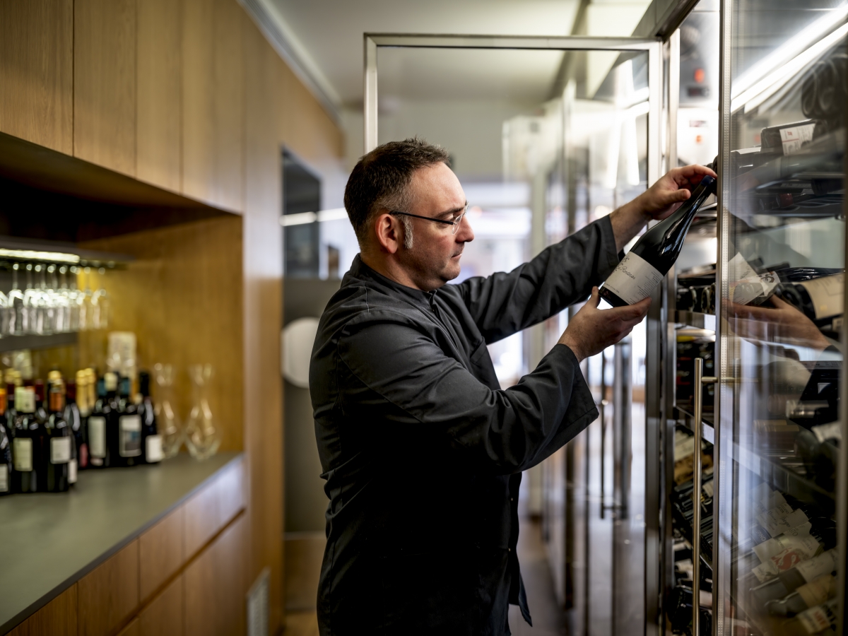 El papel de jefe de sala y sumiller recae ahora en Sergio Perales, que suma ya diez años en la empresa. “El 95% de los vinos que tenemos en carta los he probado, porque son referencias que Guillermo y yo fuimos incorporando a la bodega. La idea es continuar con la misma filosofía, porque no veo el sentido de cambiar algo que funciona. En estos momentos tenemos 1.100 referencias y una línea que apuesta mucho por los pequeños elaboradores y mucha presencia de vinos franceses, tanto blancos como tintos. También nos diferencia mucho del resto nuestra oferta de champagnes, de los que tenemos más de 120 referencias que seleccionamos todos los años. Escogemos entre ocho a diez bodegas y no traemos las botellas aquí directamente. Es decir, no están en distribución”, explica Perales, quien nos recuerda un dato muy interesante: también venden botellas para llevar a casa, y a precio de tienda, no de restaurante.