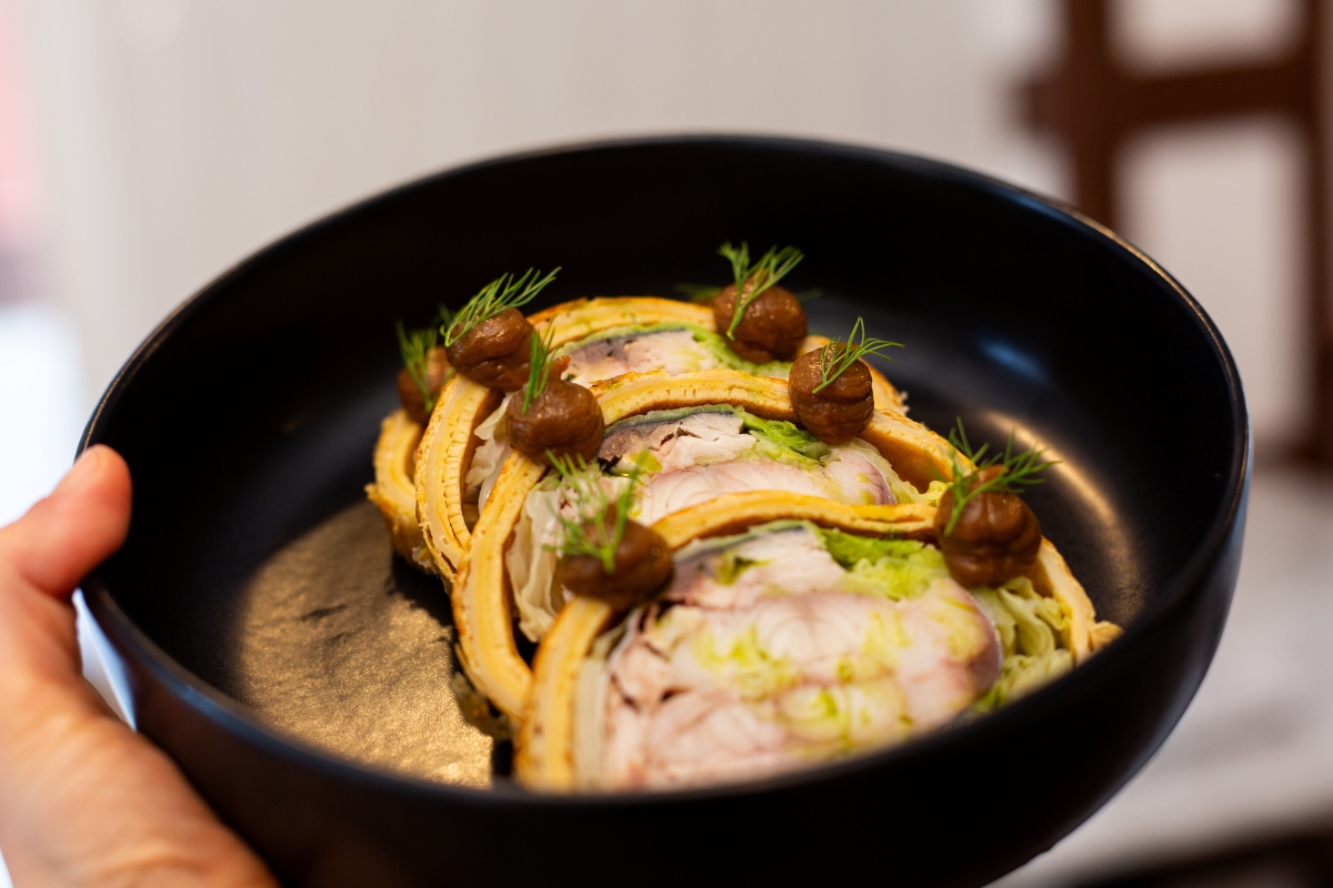 En Xaruga, Amparo Nácher prepara un Wellington de anguila y caballa —en temporada del pescado azul—. «Cuando empecé a pensar en el plato sabía que quería darle protagonismo a un ingrediente valenciano como es la anguila. Siempre me ha gustado partir de un plato tradicional y darle la vuelta. Lo hacemos acompañado de un puré tostado de cebolla y una salsa de puerro, laurel y eneldo. El hojaldre es de un obrador francés», explica. Nácher pasó dos años trabajando en París y una larga temporada en Londres. En ambas ciudades, el hojaldre está muy presente en la cocina y el Wellington no queda relegado a las festividades. Ella lo trabajó bastante durante aquellas estancias en el extranjero. La filosofía de la cocinera en Xaruga se sostiene en la recuperación de la cocina que se hacía antes, en los guisos que permanecían al fuego cuatro o cinco horas, en «proteger esos sabores naturales de antes». Nácher evidencia que esa corriente de creatividad que recorrió la cocina durante más de una década está en retroceso. «En los 2000, todos queríamos ser Ferran Adrià. Ya no», afirma.