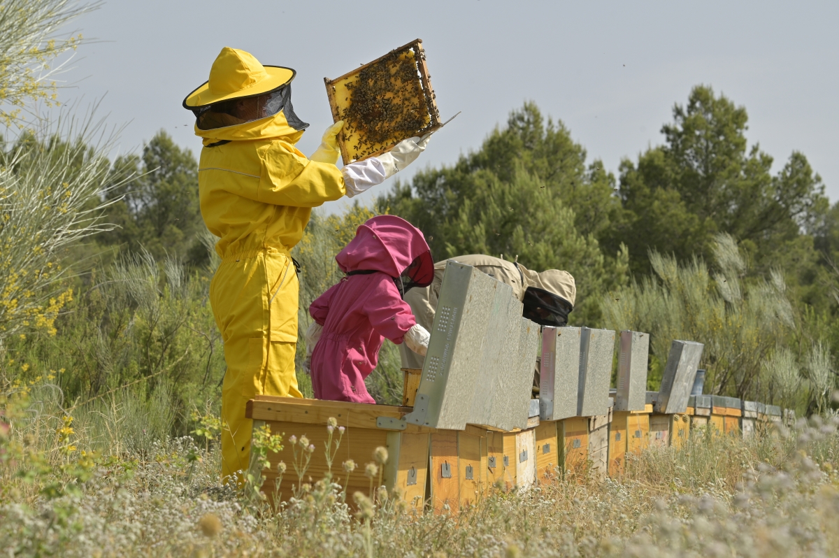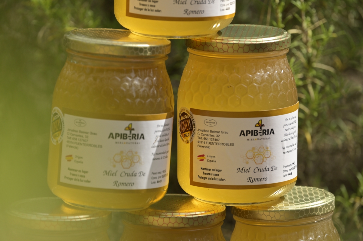Entre Camporrobles y Fuenterrobles, en el corazón de un bosque mediterráneo y alejado de la vista humana, se entrevé un colmenar. Huele a romero, y la genista pone el color a ese espacio marrón y verde en el que se encuentran las colmenas, dispuestas en hilera. El calor del verano —y más este año— estresa a las abejas, que salen de sus enjambres con un zumbido constante, profundo y armonioso. Es el sonido de la naturaleza. Jonatan Belmar abre la cubierta de una de ellas y mueve los cuadros del alza melaria para comprobar si las celdas de miel están selladas con cera. No lo están, así que cierra la tapa y abre otra para repetir el procedimiento. Aroa Marco replica lo que hace Jonatan y la pequeña Noah va de un lado a otro con el ahumador para calmar a las abejas. Todos ellos, abejas y familia, son Apiberia Miel, una empresa familiar que ha logrado situar a dos de sus mieles monoflorales como las mejores del mundo. Son su miel de azahar y su miel de romero, reconocidas con la medalla de oro en los London Honey Awards de 2024 y 2025 respectivamente.