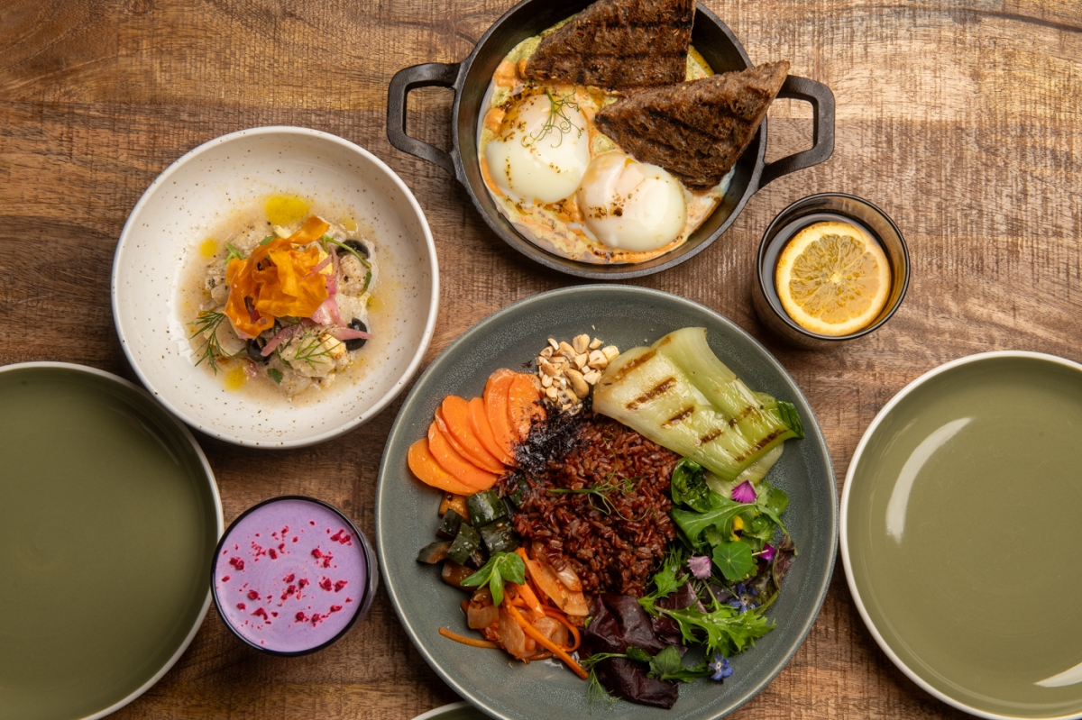A mediodía, pronto ofrecerán un menú diario. Mientras tanto, sugieren una apetecible carta con un gran protagonismo vegetal pero no vegetariana, inspirada en la macrobiótica pero no restrictiva, con platos como el ceviche de corvina, los huevos turcos o el bol Asia Street: arroz rojo, pak choi a la parrilla, alga nori, zanahoria salteada, kimchi, sésamo, anacardo tostado y pepino marinado. Una cocina viva que fusiona salud y conciencia, disfrute y color.