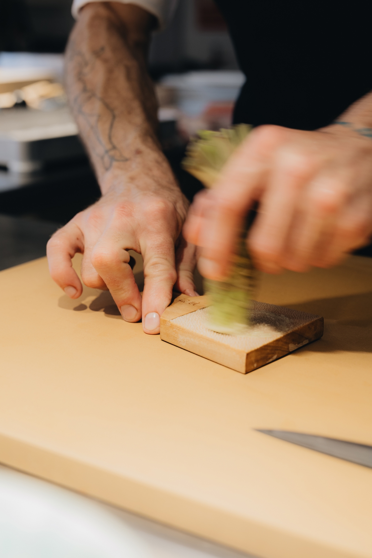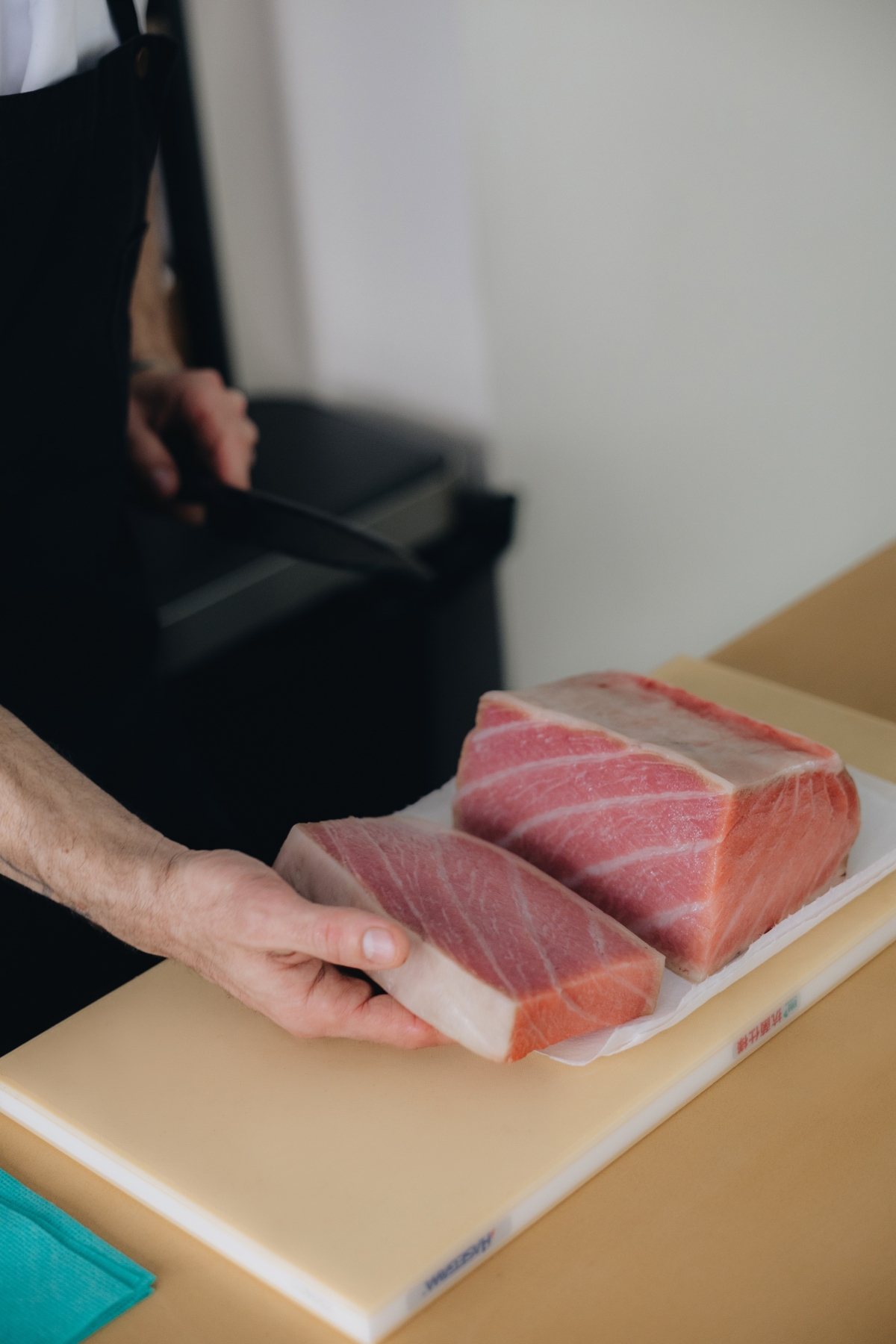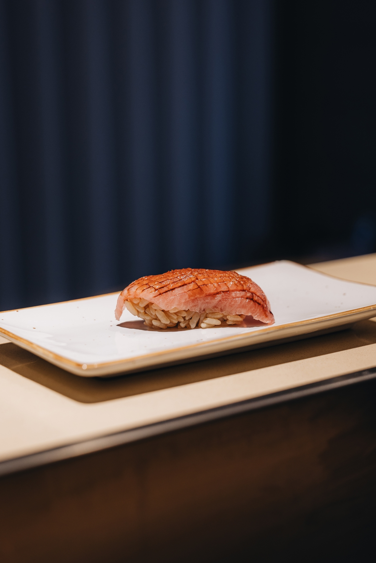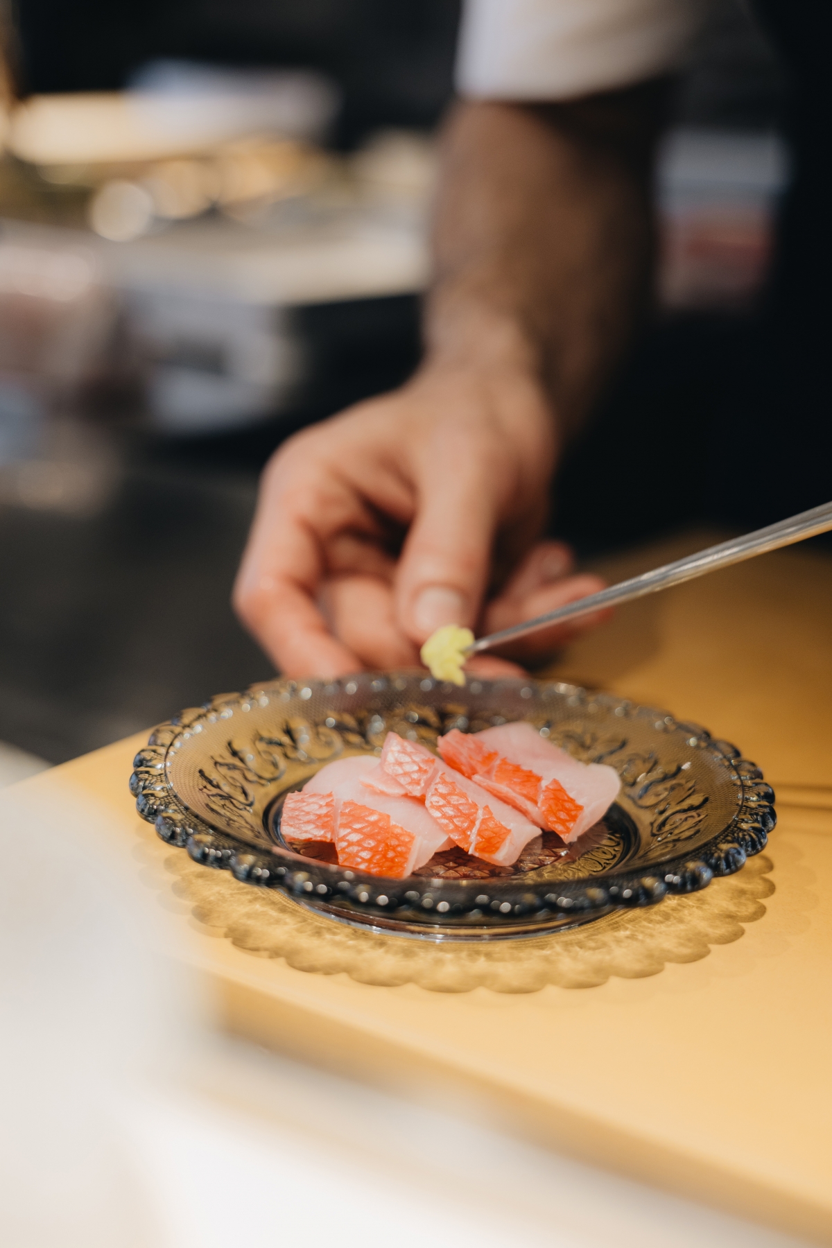 Durante nuestra visita al restaurante, Rui nos condujo a través de un menú omakase de catorce pases donde no faltaron nigiris, tatakis, usuzukuris, sashimi, kakuzukuri y otras técnicas esenciales del universo del sushi. Conviene recordar que, muy probablemente, la próxima vez que cruces la puerta, -sea la primera o la enésima vez-, el recorrido no tendrá por qué coincidir con el que aquí describimos, ya que la palabra omakase viene a significar “ponerse en manos del chef”. Y eso fue lo que los allí presentes hicimos. El resultado: un festín que conquistó tanto la vista como el paladar.