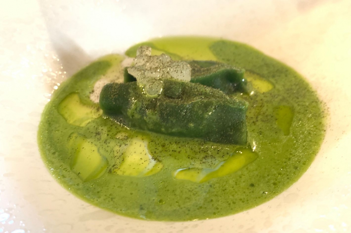 Dentro de estos platos aparentemente sencillos podríamos incluir el raviolo de ricotta y espinacas que ellos han bautizado como tutto verde. No hay más objetivo aquí que el de aprovechar al máximo el sabor y el color de la clorofila de la verdura. La acompañan con aceite de albahaca, perlas de limón y un polvo de espinaca deshidratada. Una delicia absoluta que acompañamos con un vino del centro de Italia, de la región de Abruzzo, elaborado por Marchesi di Cordaro.