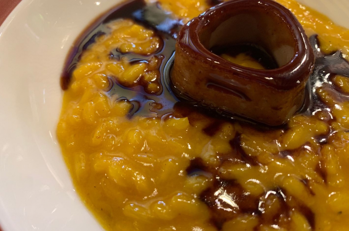 Pero si hay que hablar de los platos que nos llevaron a la estratosfera –además del ya mítico vitello tonnato de Massimo, del que ya hablamos hace un año en Guía Hedonista–, destacaría dos: el tortello rabo de toro, que aligeran con manzana y una espuma de rábano picante, y el risotto alla milanese con azafrán y ossobuco, que tiene una textura melosa y un sabor profundo y prolongado que casi me arranca una lágrima. Un risotto emocionante que guardaremos en nuestro cajón de platos italianos memorables junto al risotto de crema de crustáceos, gamba roja de Denia, bitter y limón fermentado que probamos hace un par de años en Orobianco (Calpe), el otro “Ferrari” de la alta gastronomía italiana que tenemos en la Marina Alta.