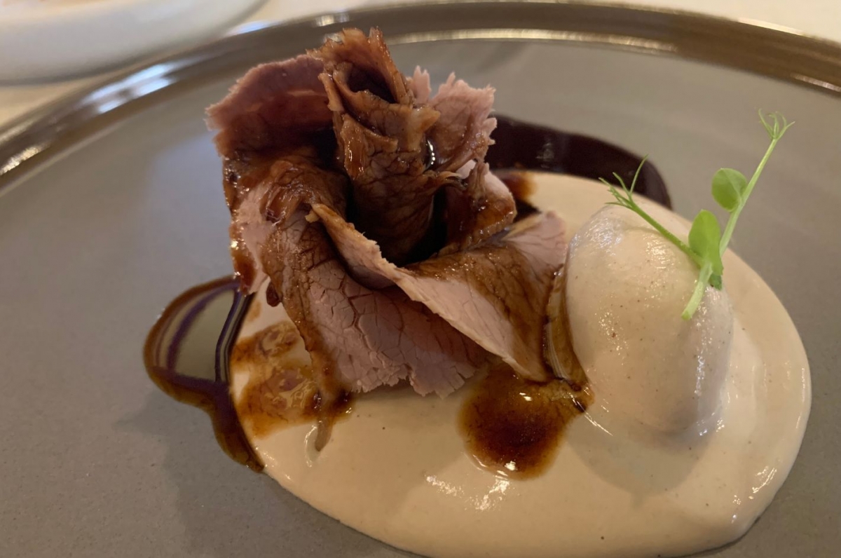 Uno de los platos más sorprendentes del menú es la lengua de vaca, receta muy típica del Piamonte que aquí varían ligeramente para hacerla más fresca –la cuecen en agua, la cortan y la pasan por la sartén y la rematan con un gel de limón, jugo de carne y una salsa verde espumosa con perejil y ajo–.