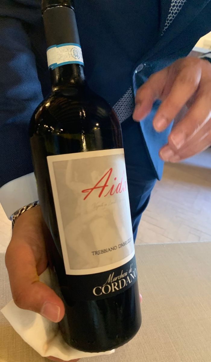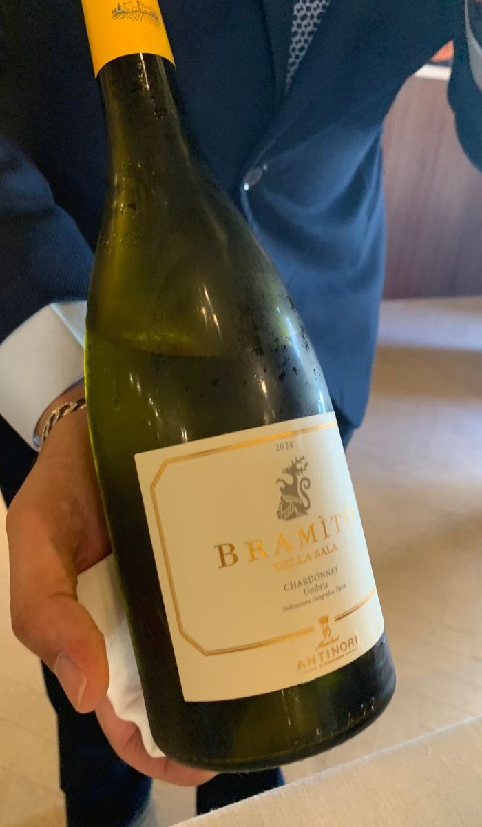 Del desfile de vinos estupendos que nos propone Giovanni a lo largo de la comida destacamos sobre todo un delicadísimo blanco de la región de Umbría de 2024, de una pequeña bodega llamada Castello della Sala (“Una pluma”, en palabras del sumiller) y un tinto con notas ahumadas de Avellino, la tierra de Giovanni, elaborado con la variedad estrella de esa región, la Aglianico di Avellino.