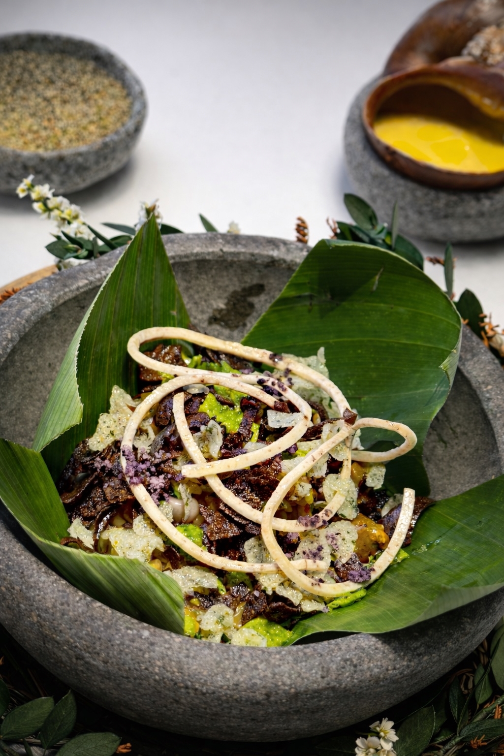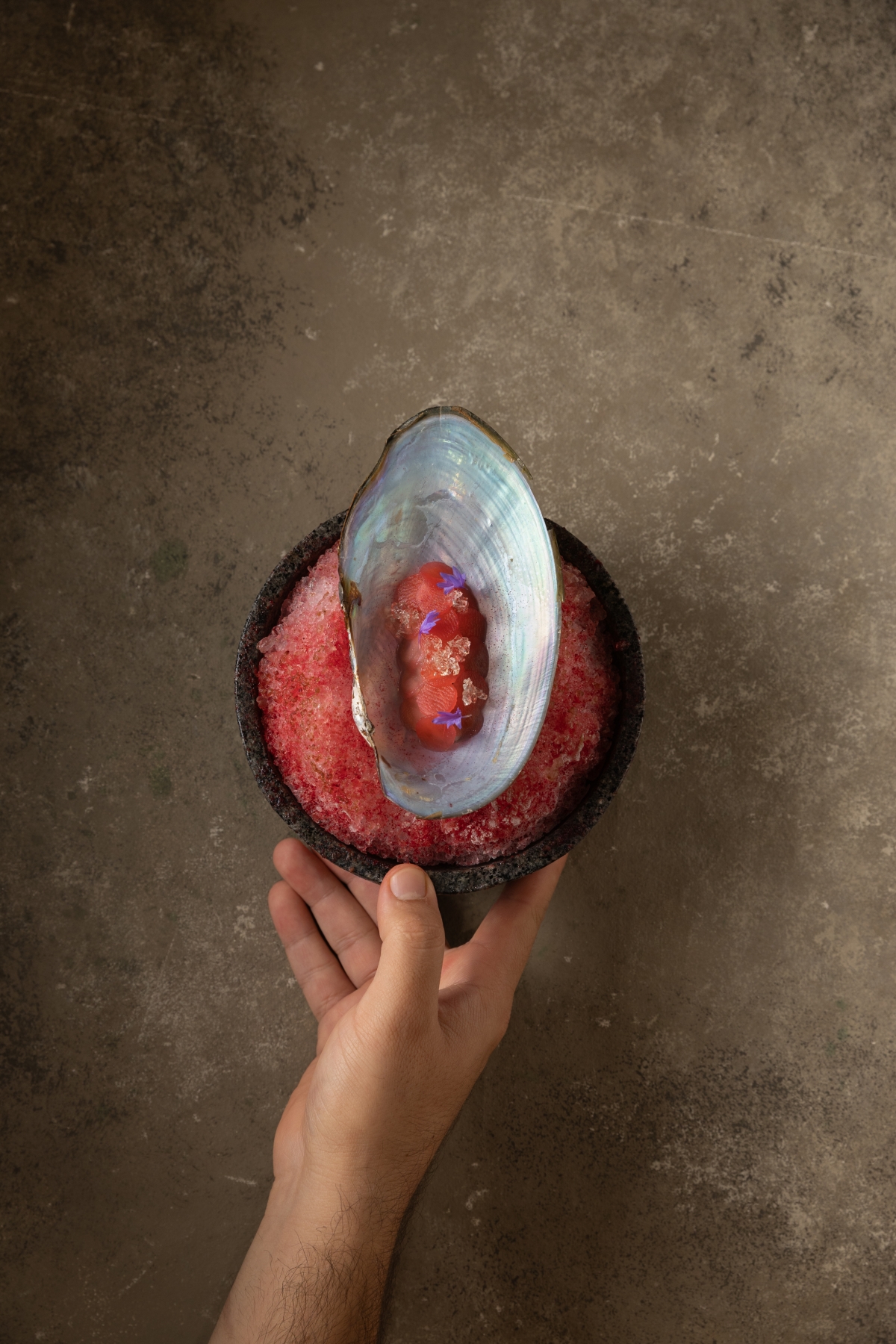 El baile comenzó con una almeja tumba de agua dulce con yacón, infusionado en camu-camu y un gel de limón rugoso muy aromático, preparado al momento por el mismo Jaime Pesaque junto al anfitrión de la velada, Ricard Camarena. Este dio paso a un plato donde el equipo de Mayta trabajó en diferentes texturas de las palmeras amazónicas: desde un tempura con un corazón de palmera encurtido con emulsión de tumbo hasta el plato principal donde encontramos un batido de pijuayo (otra palmera), con un crudo de corazón de palma con un aire de chapaja y chonta, -es así como llaman a la ensalada de palmera fresca-. El cierre del plato lo protagonizó un pequeño coco llamado chambira con el que realizan una vinagreta.
