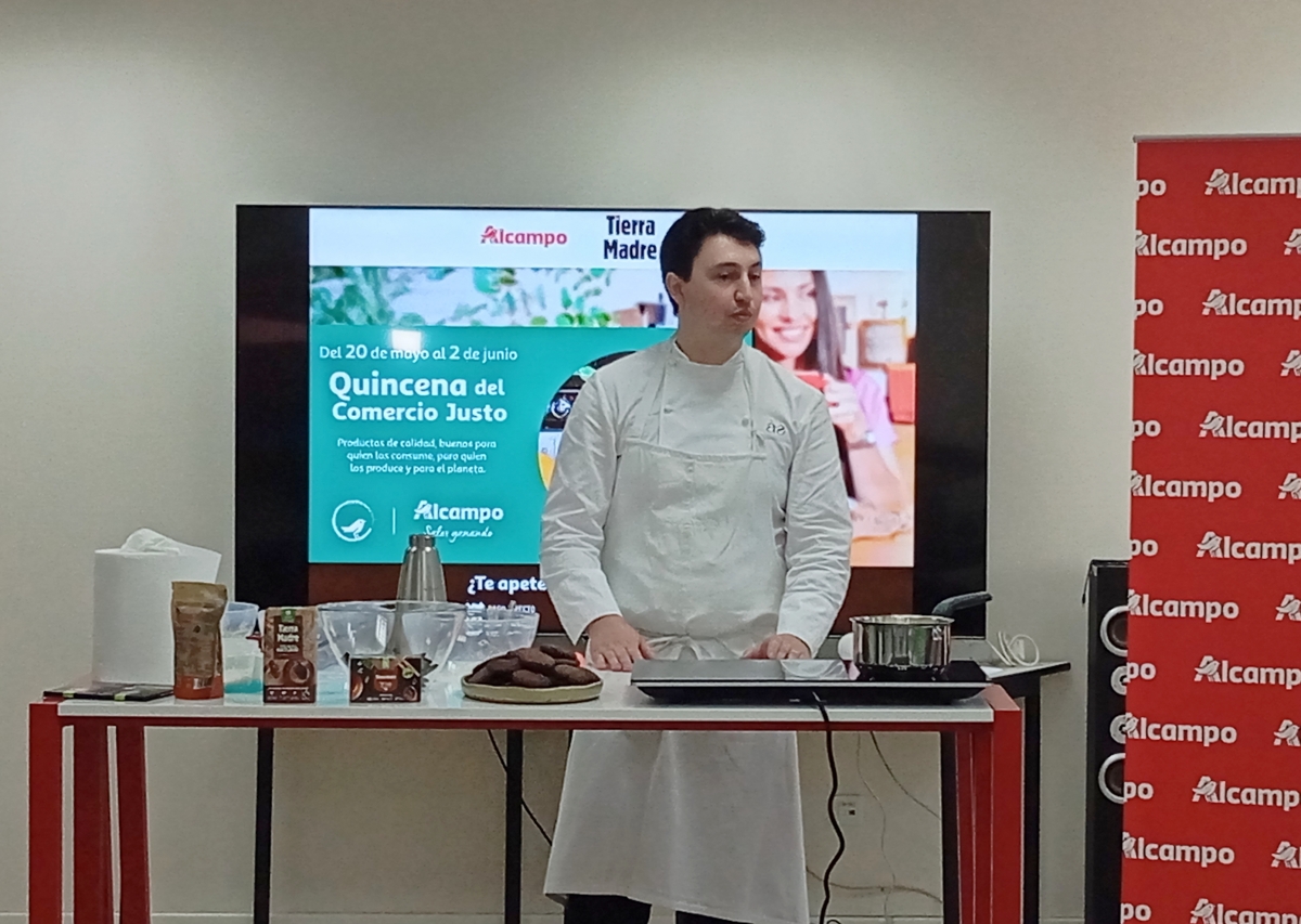 Por este motivo, Alcampo Aldaia ha realizado este miércoles un cocinado con ingredientes de Comercio Justo junto al chef Ausiàs Signes, propietario del restaurante Ausiàs Restaurant en Pedreguer (Alicante), recomendado por la Guía Michelin en 2025. El cocinero ha preparado un postre al plato con chocolate, especias y mermelada de mandarina. De esta forma se han puesto en valor los productos disponibles en los lineales.