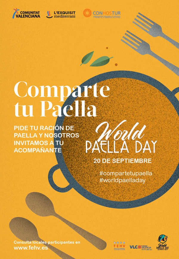 El próximo 20 de septiembre se celebra el Día Internacional de la Paella (World Paella Day) en València, una iniciativa que sirve como reconocimiento a uno de los platos más relevantes de la cocina española. En esta segunda edición, con el objetivo de promocionar dicha receta y los locales de restauración, Turisme Comunitat Valenciana, CONHOSTUR y la Federación Empresarial de Hostelería de València (FEHV), presentan la campaña Comparte tu paella, en el marco de las acciones de promoción de la gastronomía valenciana.