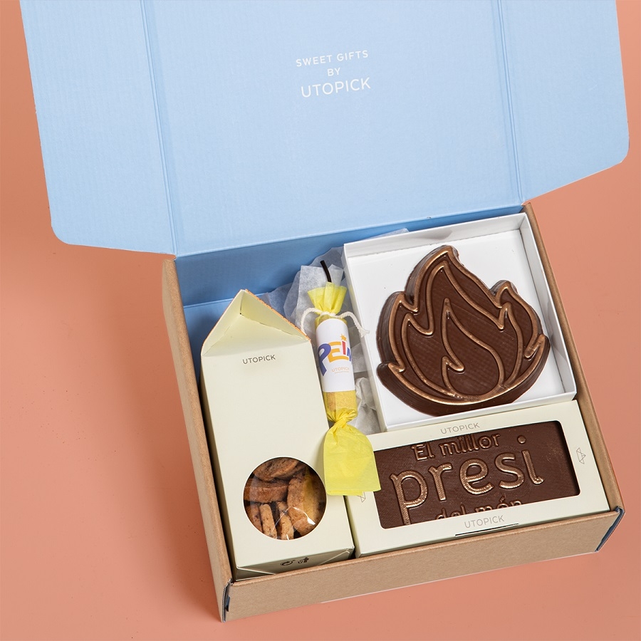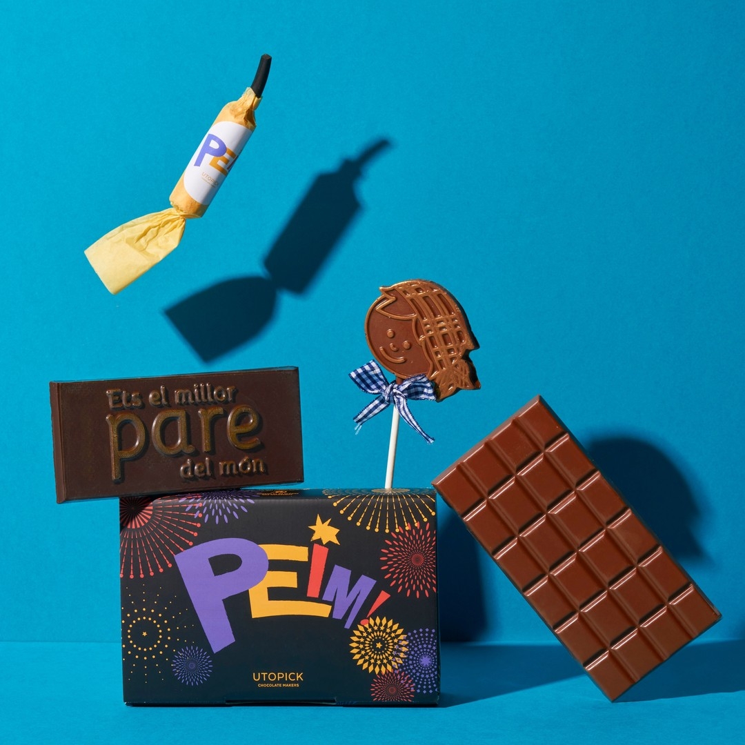 Pero Utopick es mucho más que Bombetas PEIM! y, este año, lanzan una novedad temática: el Bunyol d’Or, en homenaje al producto típico de estas fechas, que se elabora con una ganache de calabaza con especias. Completan su propuesta festiva más dulce con piruletas, tabletas con mensajes y hasta masclets de chocolate. Con más detalle…