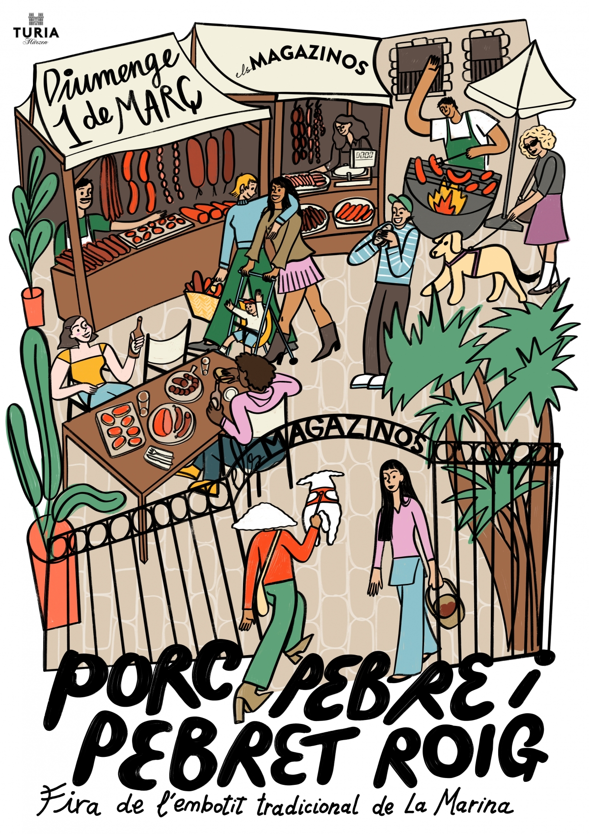 Magazinos estrena su agenda de ferias gastronómicas 2026 el próximo domingo 1 de marzo con la tercera edición de la Feria del embutido tradicional de la Marina Alta “Porc, Pebre i Pebre Roig”. Una llamada a disfrutar de la vida, plasmada en el cartel creado por la artista valenciana África Pitarch.