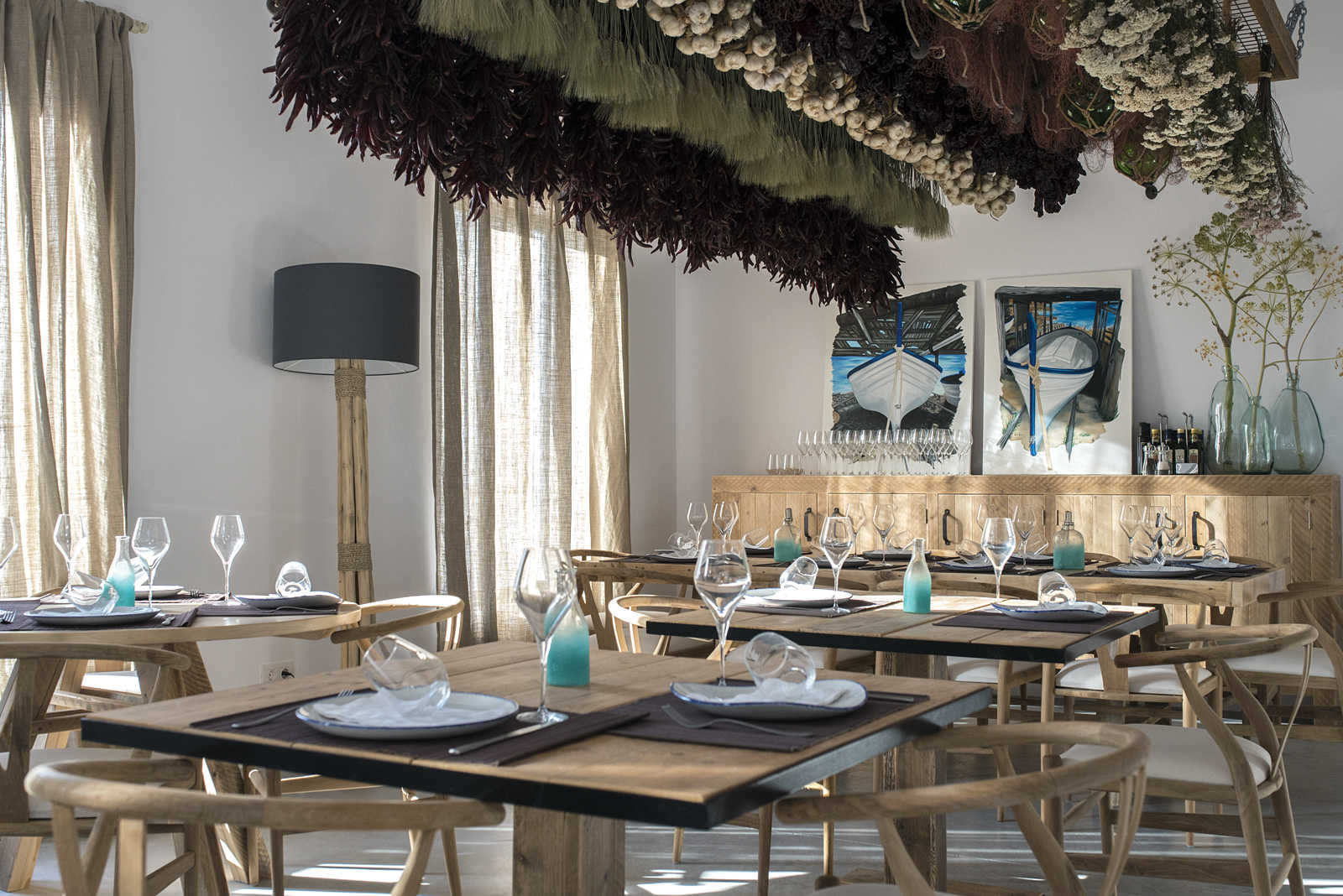 Pero la apuesta de Pep Mayans no radica sólo en la propuesta gastronómica, puesto que el local ha sufrido una reforma integrar para mostrar el espíritu de marinero de Es Caló, por eso los colores de la playa y del mar son una constante. No en vano esta localidad fue el primer puerto de la línea con Ibiza. Esta la razón de que las barcas, las redes y numerosos elementos decorativos propicien que el visitante se sumerja de lleno en el mar.