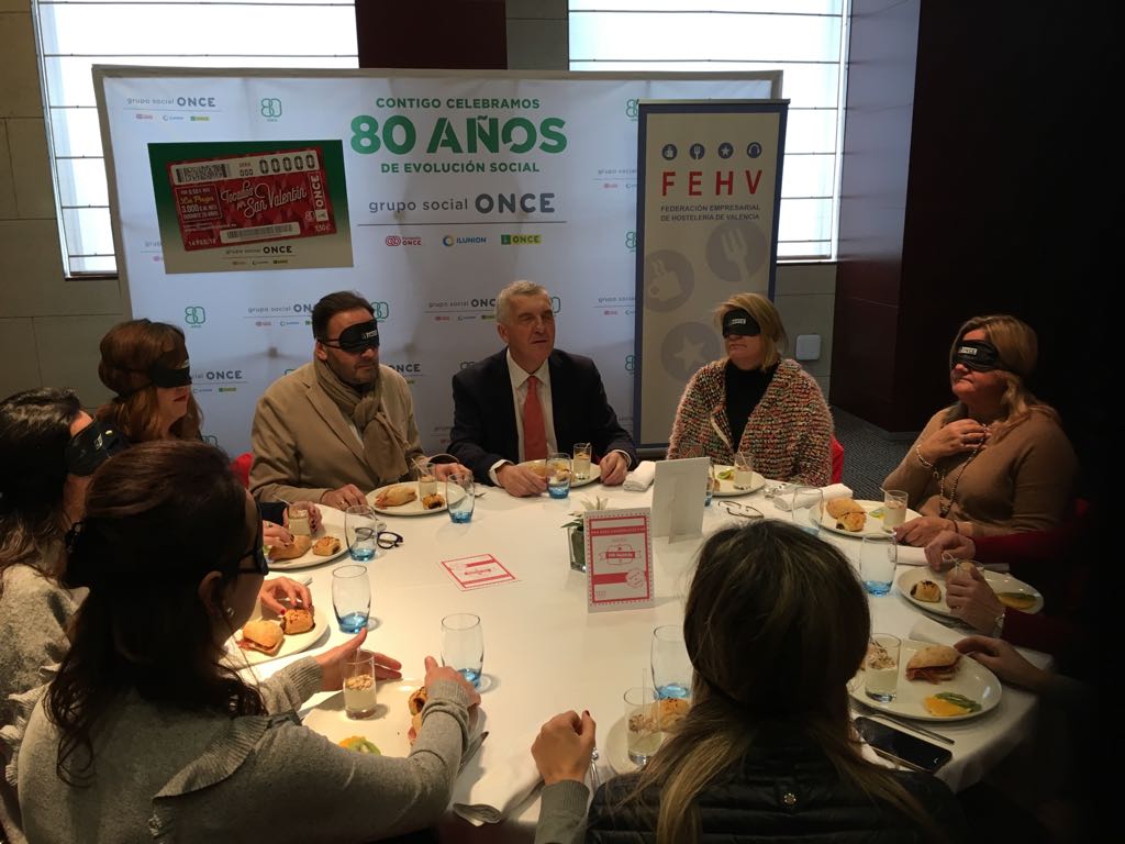 Por segundo año consecutivo, la presentación del Catálogo de San Valentín de la FEHV se ha realizado conjuntamente con la ONCE, que a su vez ha dado a conocer su Cupón Extraordinario de San Valentín del próximo 14 de febrero. Con este motivo, los medios de comunicación e invitados asistentes al acto han podido disfrutar de un "desayuno a ciegas" en el que han experimentado en primera persona una actividad cotidiana tal y como la percibe una persona con discapacidad.