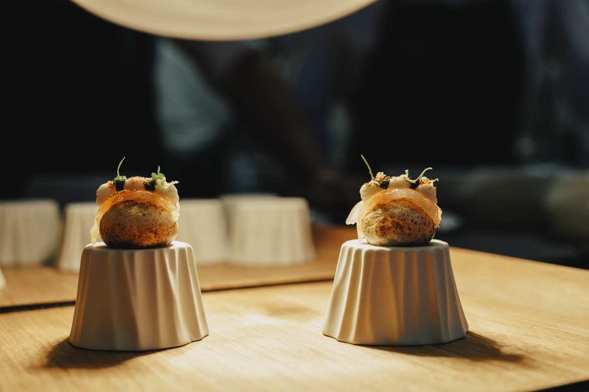 Desde las alturas de Calpe y con el Peñón de Ifach como telón de fondo, el personal de sala, capitaneado de forma excelente por la maitre Inês Correia, dio inicio al servicio. El Tomate y “Cinta Senese”, Homenaje a España, de Moebius, fue el primer plato en salir. A partir de este instante, ambos restaurantes combinaron la versión antigua y nueva de una misma propuesta. Un buen ejemplo fue el calamar. Moebius cocinó calamar al caviar, remontándose así al año 2015. Por su parte, Orobianco sorprendió con su tartar de calamar, guanciale, almendra y yema curada, el cual gustó mucho a los comensales.