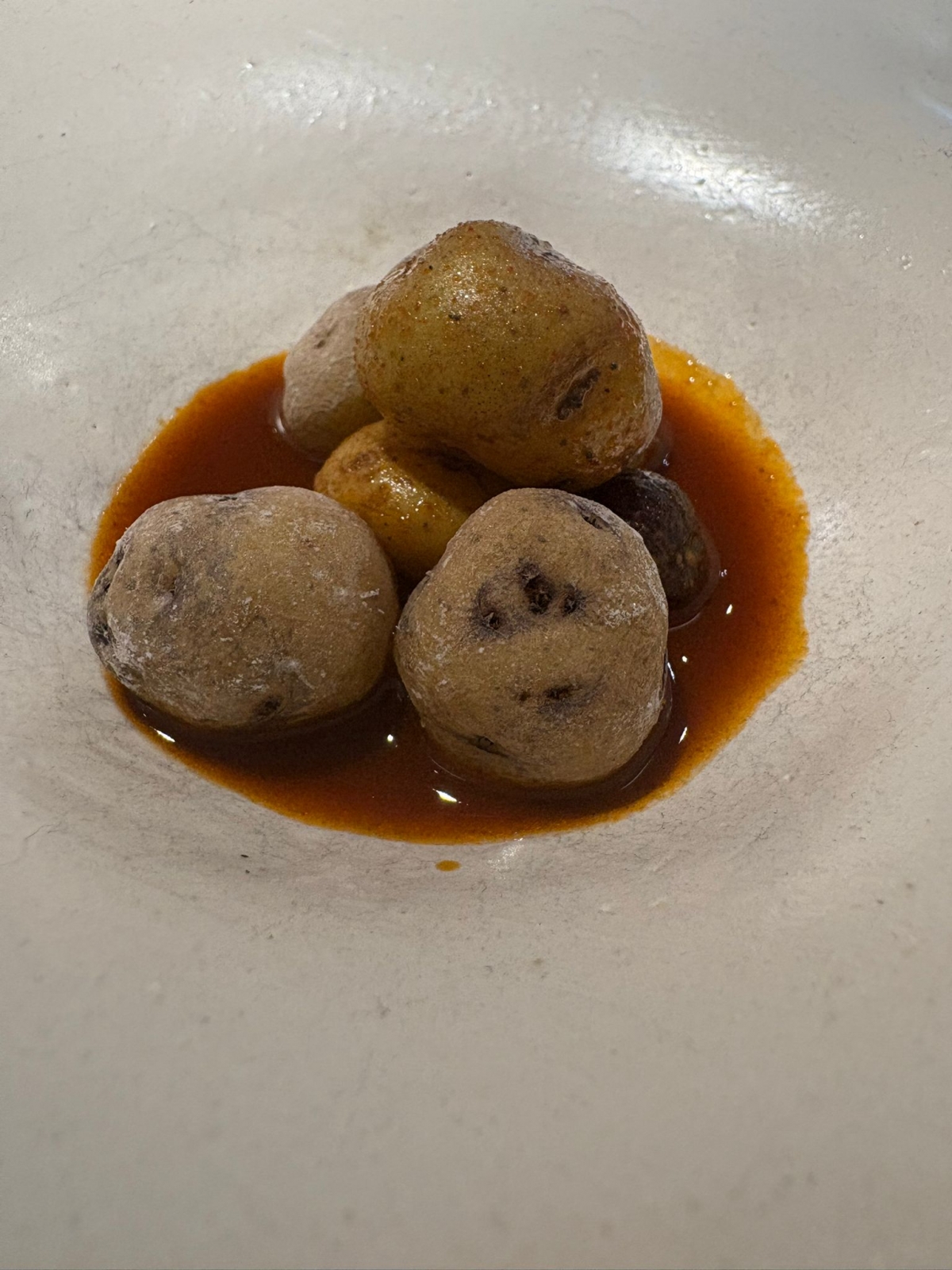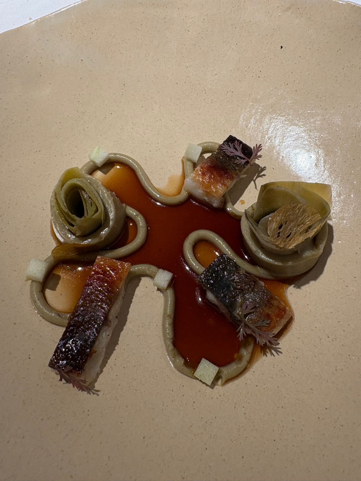 Platos como la carne de fiesta en adobo tradicional, el escaldón de pescado con gofio de millo gomero o el frangollo con confitura de pasas y vino dulce reflejan esa conexión con la memoria gastronómica de las islas. Una de las señas de identidad del chef es su particular uso del mojo canario, que en muchos de sus platos deja de ser solo una salsa para convertirse en un fondo o ingrediente que aporta profundidad y complejidad al conjunto.