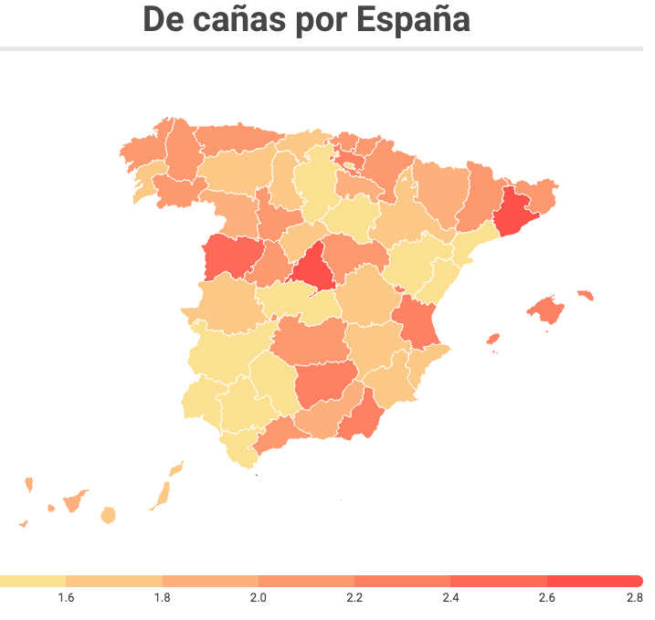 El portal de ahorro Cuponation.es ha realizado un estudio a través de una encuesta en 103 bares de las principales plazas de cada una de las 51 capitales de provincia y 2 ciudades autónomas. Según el mapa de precios obtenido, el coste medio de una cerveza en España es de 1,87 euros. La más cara la podemos encontrar en el centro de Madrid, cuya media se sitúa en 2,93 euros y en el otro extremo encontramos a Cádiz como la provincia más barata, con 1,25 euros.