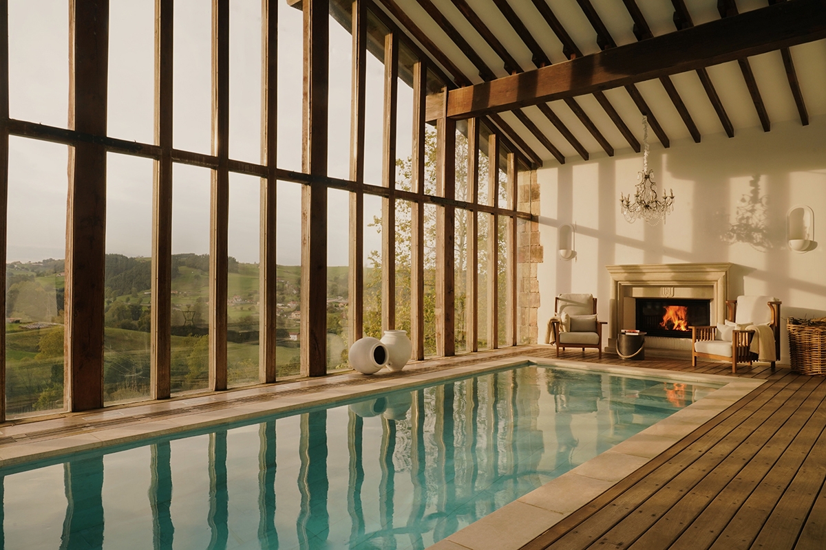 A todo ello se suma su zona de bienestar. Y esta no es como las demás. Tiene una piscina climatizada que se abre al paisaje y que tiene dos zonas, una interior con chimenea (mejórame el plan) y otra exterior mirando a los verdes prados.