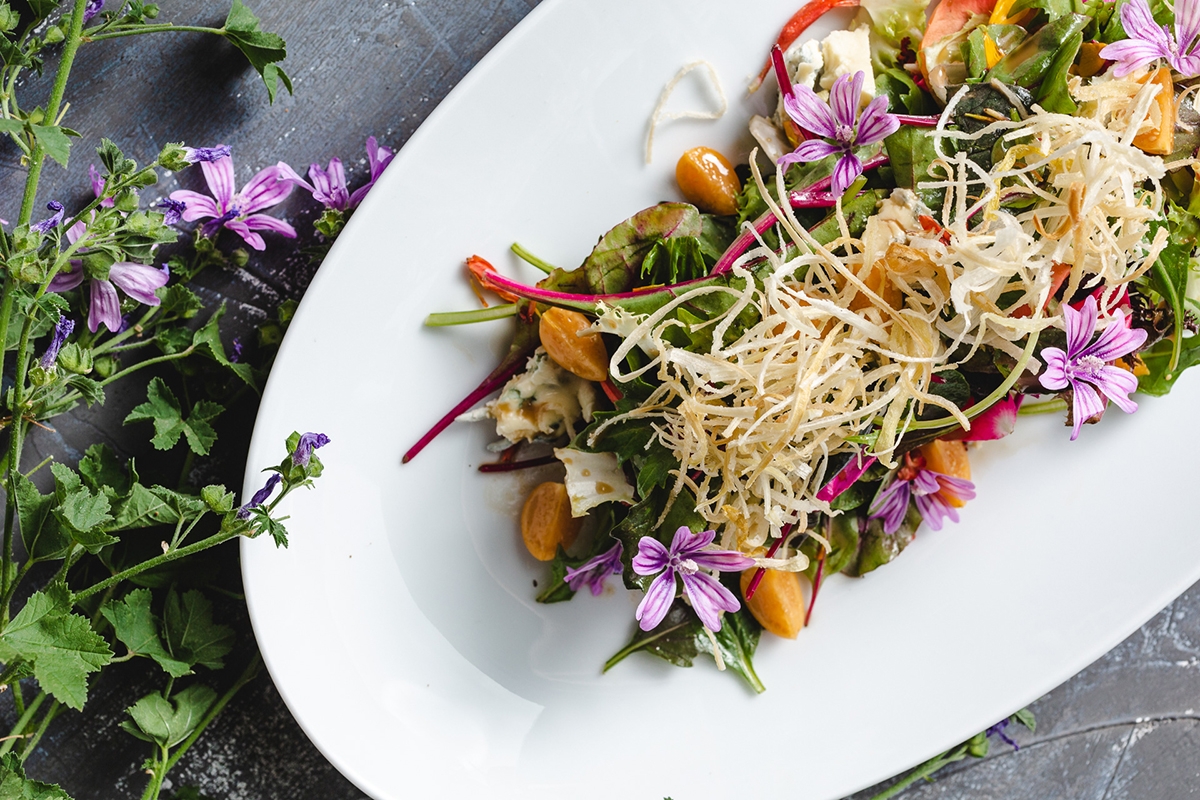 Aquí no hay carta cerrada ni platos que se repitan. Lo que llega a materializarse en la mesa, depende de lo que ha crecido, florecido o madurado ese día. Su cocina es sencilla en apariencia, pero muy pensada: hierbas, flores, fermentos, vinagres, aceites... Y todo lo que hace, está de vicio. De una tempura hecha con crisantemos amarillos, dalias y pétalos de caléndula a unos canelones de plantas silvestres y brotes.