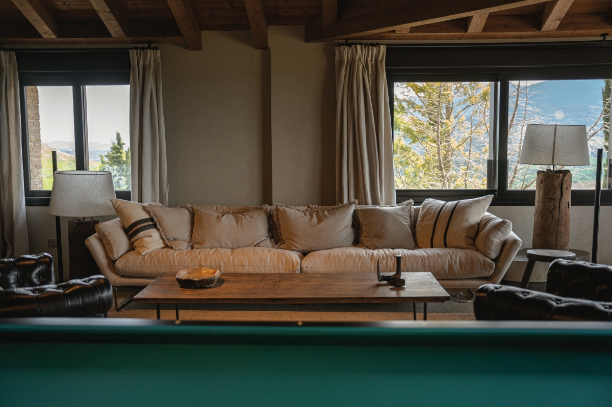 Todo tiene mucho de eso. El salón principal, por ejemplo, gira alrededor de un billar de carambola que era el sueño del padre, que siempre decía que algún día haría una casa alrededor de un billar. Los muebles no son de catálogo: hay librerías antiguas, mesas que antes estaban en la casa familiar, objetos con historia. El edificio es piedra, de cantera cercana. Suelo radiante en todo el hotel, materiales nobles, proveedores de la zona.