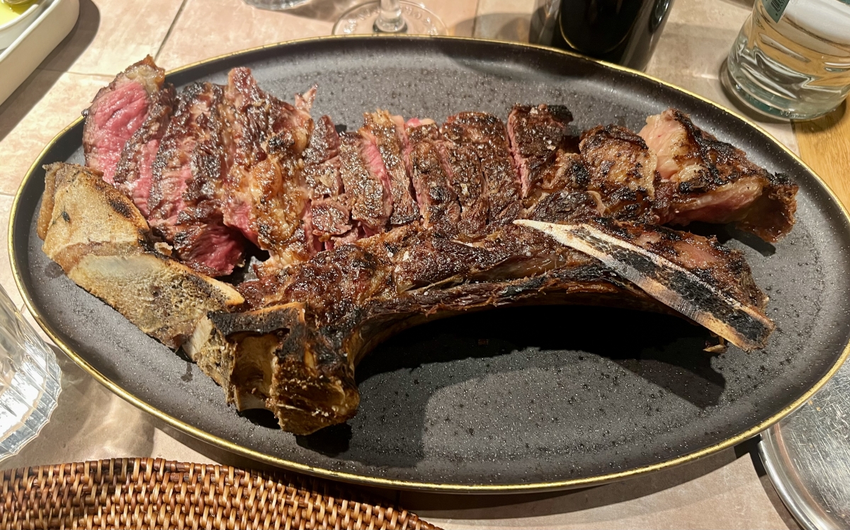 La que comimos el miércoles –una de las mejores chuletas que he probado nunca– cumplía todo. Elegante y sutil, con un sabor intenso pero agradable y una infiltración de grasa sedosa y equilibrada que le eximía de toda pesadez. Sin esas largas maduraciones que tan de moda se pusieron hace unos años y que personalmente, me cansan. La chuleta sabía a lo que tenía que saber, sin trucos ni elementos extra, más allá de lo pimientos pilpileados y las patatas fritas –otra barbaridad–.