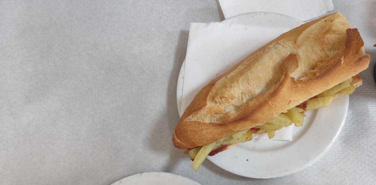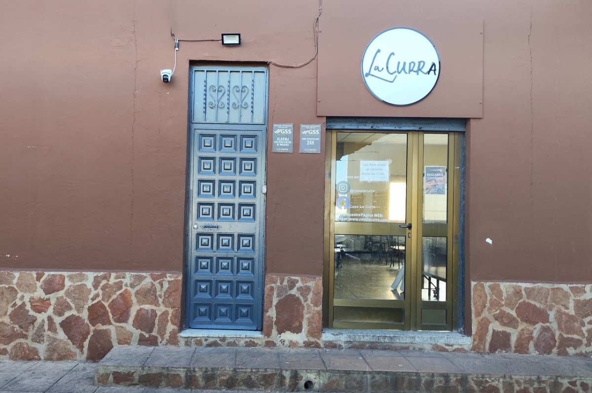 Entrar por la puerta del restaurante es sinónimo de acercarse a una barra de bar con solera. El pasillo largo y amplio comunica esta estancia con un comedor de mesas vestidas con manteles de papel blanco. Hay que atravesarlo — y es una suerte —: en este pasillo se encuentra la zona de brasas donde se eligen, preparan y entregan los bocadillos de los Almuerzos Populares de La Curra. No se piden en mesa ni en barra, pueden tomarse en el comedor o pedir para llevar, pero hay que acercarse a la bancada junto al brasero, hacer su popular cola y elegir entre lo que está preparado: pisto, habitas, diferentes tipos de tortilla, morcilla, longaniza, patatas fritas a la lumbre… Una vez elegido el contenido, el bocadillo está listo.
