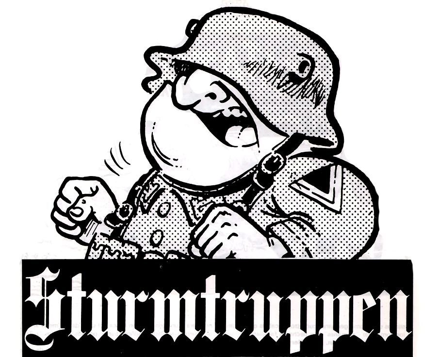 En Strumtruppen, en principio los alemanes fueron caracterizados con todos los prejuicios posibles del estereotipo, salvo pocas excepciones, como algunos soldados rasos. En los años 60, aquello suponía darle al tentetieso de lo lindo, como se hacía en el cine hasta el exceso. Sin embargo, aquí se cruzaban líneas y se tocaban temas delicados, como el más delicado de todos, el Holocausto. Había chistes como uno en el que los soldados que custodian un campo de concentración se introducen en las "duchas" de los prisioneros judíos para quejarse de que son mejores que las suyas y luego darse cuenta de que ahí huele a gas. En otra, a un soldado en el frente le envía una carta su novia judía y se alegra de que no haya tenido problemas por las políticas raciales. Dice que está muy bien, que la han llevado a un resort de vacaciones: Ravensbrück.