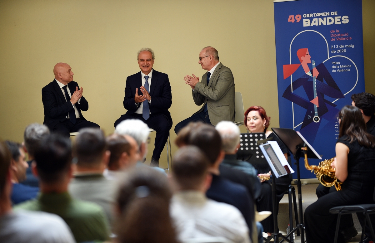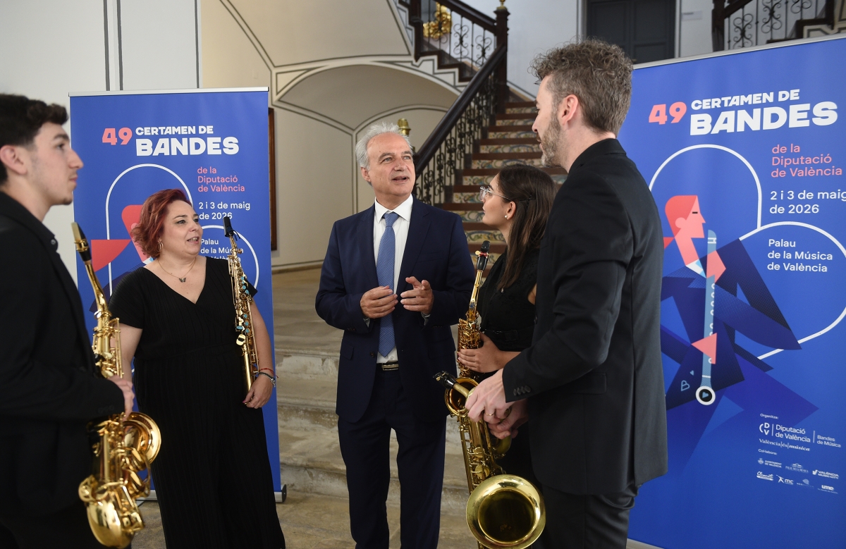 VALÈNCIA. La Diputación demuestra un año más su implicación con la música de banda, y van 49, lo que supone estar “en vísperas de un 50 aniversario que será muy exclusivo y al que llegamos con una respuesta masiva de las sociedades musicales”, destaca el diputado de Bandas de música, Ricardo Gabaldón. Él ha sido el anfitrión de la puesta en escena del Certamen de Bandas que se celebrará el 2 y 3 de mayo en el Palau de la Música, el primero en tomar la palabra tras los acordes de La vida es bella y Cinema Paradiso interpretados por el cuarteto Elle Sax.
