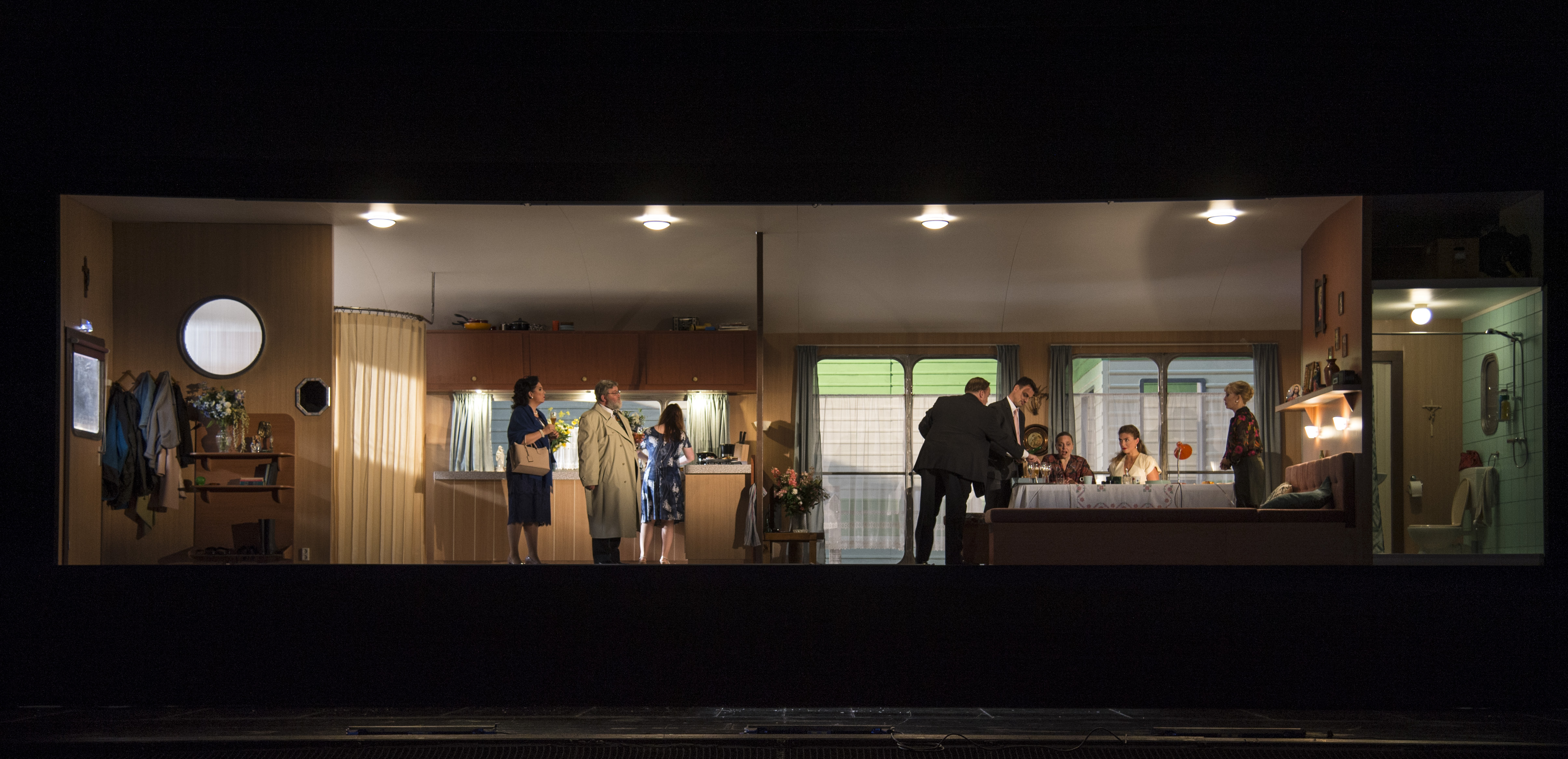 En l’aproximació a Jenůfa, Katie Mitchell incideix en la visió feminista del text original de Gabriela Preissovà i situa l’epicentre del conflicte entre ambdues dones en el dany atroç que va patir la madrastra en el passat i el fracàs de la societat per a protegir-la enfront dels homes violents. “El fet que la història poguera ocórrer en aquest moment és aborronador”, explica Mitchell, que aposta per un muntatge hiperrealista, que trasllada el drama rural de Janáček a una Moràvia actual, amb tecnologia, ordinadors de sobretaula, telèfons amb càmera, en la qual Jenůfa treballa com a administrativa i viu amb la seua madrastra en una caravana repleta de crucifixos, però en la qual encara continuen presents els actes violents contra les dones i les relacions abusives.