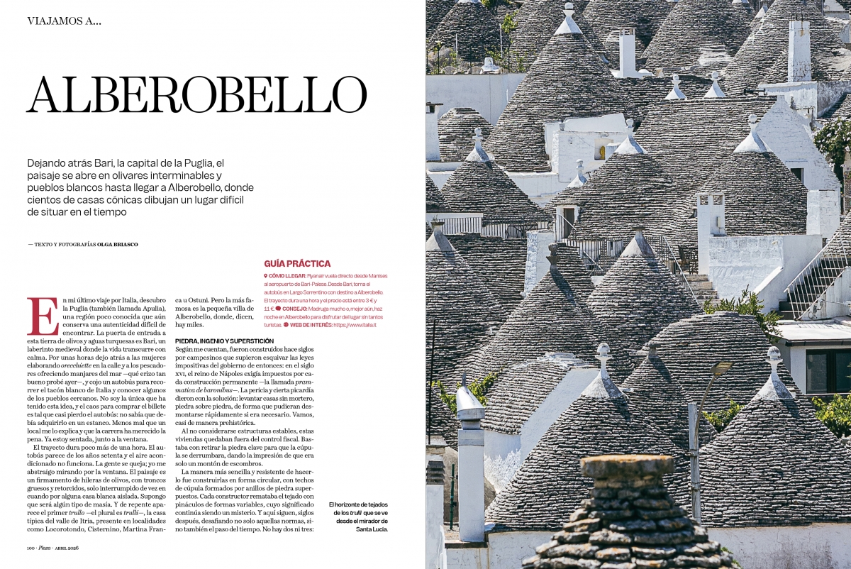 En mi último viaje por Italia, descubro la Puglia (también llamada Apulia), una región poco conocida que aún conserva una autenticidad difícil de encontrar. La puerta de entrada a esta tierra de olivos y aguas turquesas es Bari, un laberinto medieval donde la vida transcurre con calma. Por unas horas dejo atrás a las mujeres elaborando orecchiette en la calle y a los pescadores ofreciendo manjares del mar —qué erizo tan bueno probé ayer—, y cojo un autobús para recorrer el tacón blanco de Italia y conocer algunos de los pueblos cercanos. No soy la única que ha tenido esta idea, y el caos para comprar el billete es tal que casi pierdo el autobús: no sabía que debía adquirirlo en un estanco. Menos mal que un local me lo explica y que la carrera ha merecido la pena. Ya estoy sentada, junto a la ventana.