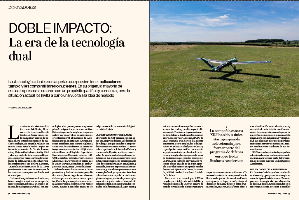 El proyecto de XRF arranca en 2022 como una empresa dedicada al desarrollo de videojuegos que impulsa el emprendedor canario Gustavo Medina. «Durante la erupción del volcán de La Palma, y como media España, sentimos la necesidad de ayudar en todo aquello que pudiéramos. Así pues, compartimos con algunos responsables de emergencias la idea de tener información actualizada y accesible, con una experiencia de usuario única, y con el tiempo comenzamos a tener feedback y a aprender. Este descubrimiento nos impulsó a realizar un giro estratégico, pivotando por completo nuestro negocio hacia el desarrollo de soluciones tecnológicas avanzadas centradas en la funcionalidad, la precisión y la toma de decisiones rápidas, con consecuencias reales y de alto impacto. De la mano de Telefónica, llegamos al mundo de la defensa, donde nuestra solución aporta mucho valor», declara el CEO de una compañía, que, hoy en día, cuenta con treinta y siete empleados y delegaciones en Miami, Madrid y Las Palmas y cuyo objetivo es consolidar firmemente su posicionamiento en el sector de la defensa y la seguridad, apoyando la toma de decisiones en escenarios complejos. La Dana que sufrió la provincia de Valencia el año pasado es un buen ejemplo. Entre los clientes que puede revelar destacan el Ejército de Tierra, la Armada, NEOM (Arabia Saudí) o el Cabildo de La Palma.